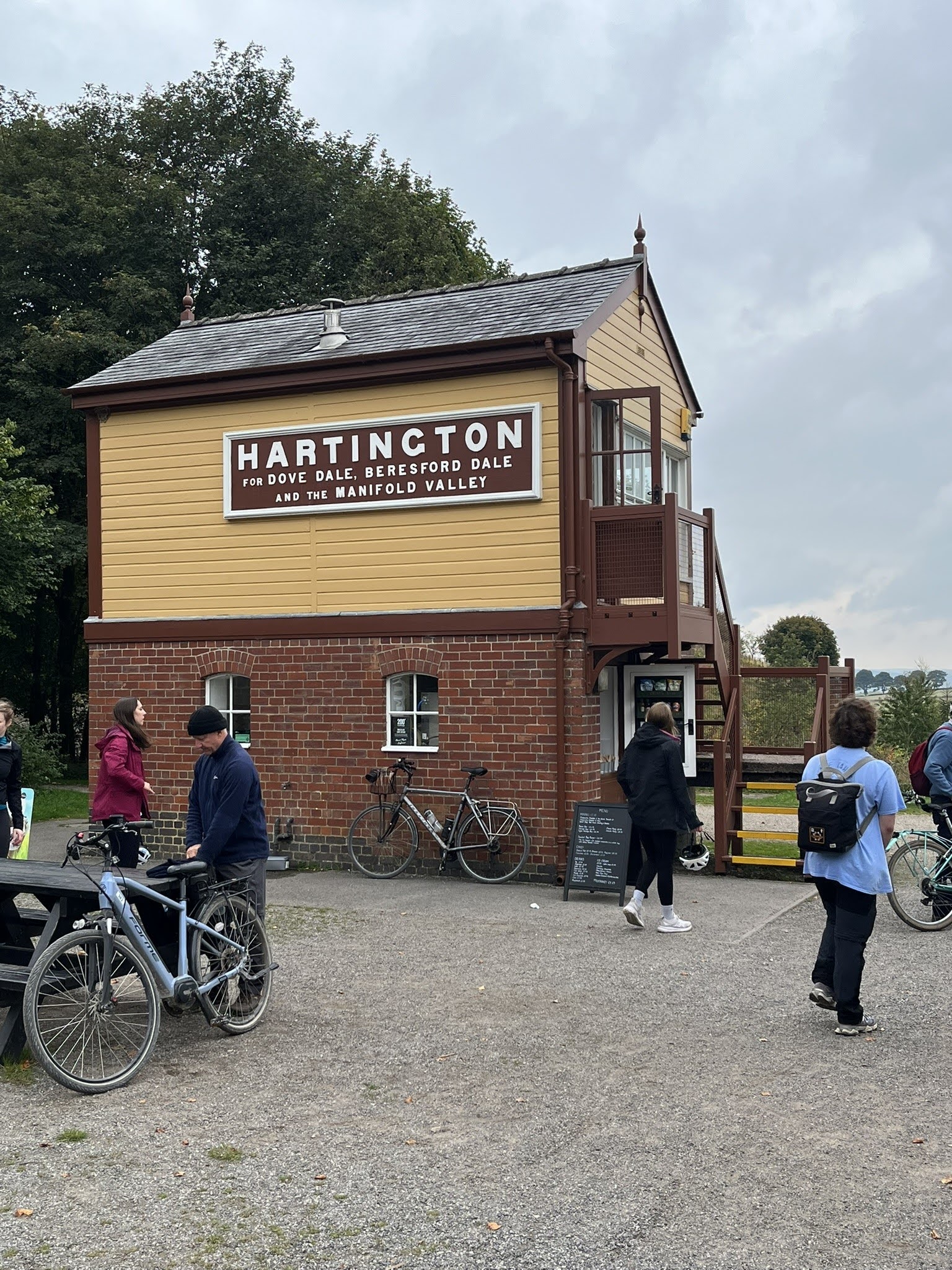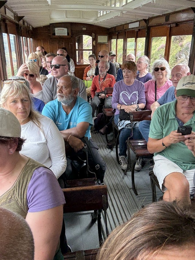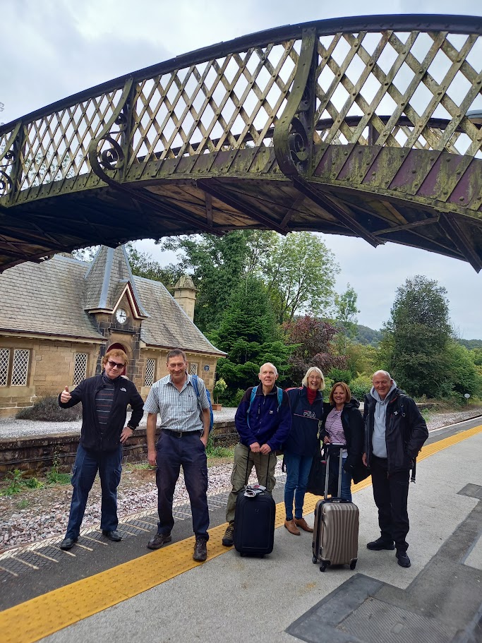 Saturday was another warm sunny day as we collected our cycles from Middleton Top Engine Room. Our cycle ride was following the High Peaks and Tissington Trail built on former freight used railway lines. The cycles were relatively new and perfect for the 26-mile ride. We crossed the White Peaks landscape, passing ancient stone-built manor houses and endless dry stone walls dividing the pastures. Some of the farmhouses had been converted into holiday cottages, and new wind turbines dominated one section. We detoured to Biggin village for coffee at the inn before arriving at Hartington Station. The signal box is still present and now houses a café. We climbed to the upper storey to try to shift the signal levers. We arrived at Pasley Hay Station where Judith exclaimed "I wish we could extend the ride, its jolly good fun". We met a late arrival and then headed back soaring along the former railway line on an embankment with great views of the rolling hills of the Peak District. Back at base more tea and Lemon Drizzle Cake before Brian led the railway group via a secret path to the Steeple Grange Light Railway. Next to the hostel, yet totally hidden from view, this is another former quarrying railway now a narrow-gauge line on an incline. We dined in Wirksworth without the mystery Sea Bass incident from Friday (a very long story). Mellow Mike was the star at the karaoke, the whole pub applauding his peerless performance of "Living next door to Alice". Back at the hostel it was last night party time as Jeff displayed his stealth skills by disappearing and rematerialising in unexpected places. Rob and Rob discussed vintage motorcycles whilst Nick and Jeremy demonstrated their suitability for solving the world's problems.