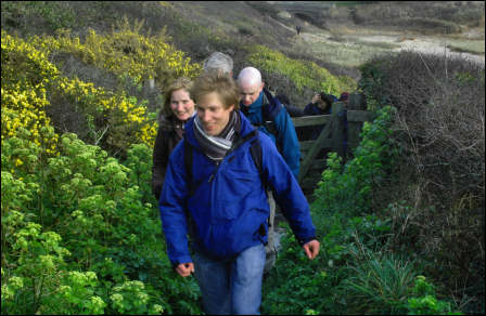 On Friday at 10 am Tom led 18 of us on a 10 mile walk along the coast to the south of the hostel. We had blue skies and gusty winds and breathtaking views of the crashing waves and spray of the sea bubbling up into the sky and falling like foam or snow drops. Lots of stops along the way to take photos, I've never seen so many members taking photos of the sea, sandy bays and rocks, but it was spectacular. We were extremely lucky with the weather, as we could see dark clouds inland. It remained dry, sunny but very cold winds, we had to be careful not to go to near the cliff edge and get blown over, unfortunately a member of the public did and a Sea Air Rescue helicopter and ambulance were required. We stopped at the National Trust Visitors Centre around 1pm for lunch and a welcome hot drink and cream teas and warm food. Some of the group walked down to the beach whilst the tide was out to explore. Tom did a head count - only 17! Had we lost someone on the way? He then realised he hadn't counted himself. We headed back along the coastal path, breaking into 3 smaller groups, walking back to the hostel, the black clouds looming our way and the tide coming in. Arriving back at around 5.30pm, it started to rain heavily and we were all glad to be back inside. Everyone enjoyed the walk, a comfortable pace for a big group. We all had a healthy glow. Well done to all.