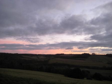 Six of us were at the start point early, before 7.45am, and thinking that was it, we headed up the West Wycombe Hill. Half way up a screeching car and a yell announced Emma had arrived and we were to be seven. At the top of the hill we could see a collage of colours: ahead, red sky, blue sky, white cloud, yellow and orange beams, and behind us in the distance, the disappearing dark of the past night. And just before official sunrise (08:07) Steve N arrived, taking us to eight.