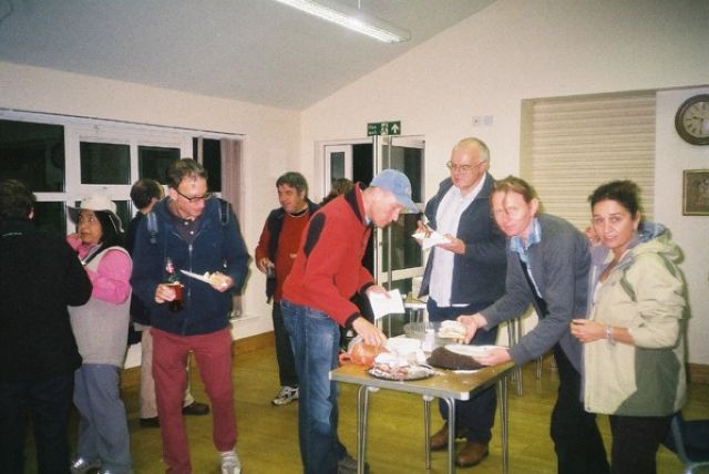 After lunch we picked up the Oxfordshire way and followed this until we reached the M40, where we turned south heading for Stoke Talmage. We then encountered a large field full of sheep and lambs. Marin was captivated by the sight, and keen to get many pictures. Or maybe he was thinking of dinner. The final few miles were very picturesque. We passed through the hamlet of Clare and then, descending slightly, we passed Clare Hill Farm where we had cracking views south toward the village of Pyrton. On the approach to Pyrton a kindly couple told us that the annual church fund raising bash was being held in the village hall. This was very timely, as a number of the group were in desperate need of tea and homemade cake. We were not dissapointed: cakes a plenty and free fill-up of tea! A number of the group bought whole cakes to take home.