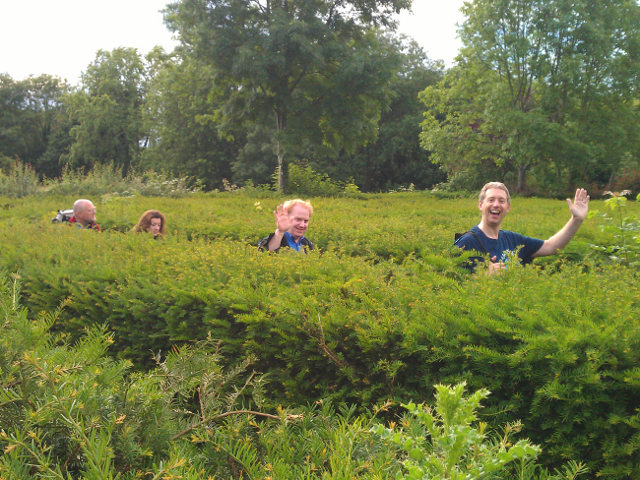 We then had our picnic lunch next to the Japanese water gardens where Jan produced her huge Herman the German fruit cake. After the cake Vic led us into the maze where we lost Jeff and Harpreet and eventually found David in the middle as he was signalling the route via his extended aerial to everyone lost in the maze. On escaping from the maze Peter led us with commentary through the Profumo sights, the fountain, swimming pool and hidden pavilion. Dusk was approaching but, as planned, we had time to make it to the excellent orangery tea rooms. Nancy A could not make it, however Jane came to the rescue and kept up the cake theme by giving everyone jubilee-wrapped portions of her splendid icing-covered fruit sponge cake.