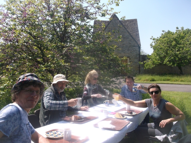 On Saturday after having breakfast in the sun with Brian Matthews we set off. Anne led one group on a walk around Orford Ness, a huge bank of shingle built through "long shore drift". It is reached by ferry and is an uninhabited nature reserve full of wading birds. There are also remains of nuclear test sites from the Cold War era. Brian led the cycle group on a leisurely ride passing through sleepy villages with impressive medieval churches. Our route took in Rendlesham Forest and the ex-USAF Bentwaters airfield, now preserved as a museum and enterprise park. After lunch at Orford Castle we continued along the coastal track to Snape Maltings. This is a community hub with arts centre and concert hall (home of Aldeburgh festival). We enjoyed the extensive views from the balcony café. Leo discovered some more pubs to pop into on the way back and Dean came upon a magicians group in one garden with expected consequences.