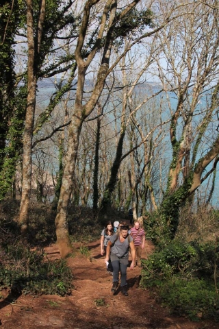 On Saturday, rain did not stop play. Several people took advantage of the finally-open castle, and the Dart steam railway to Buckfast Abbey. After participating in the famous tonic liqueur, made famous with winos in Glasgow, everyone was full of vim and vigour. The very keen on the other hand travelled 10 miles along the Dart Valley trail, passing the glorious Sharpham vineyard, and engaging in two pubs and one tea room due to excessive dampness as expected in a beautiful riverside woodland path. Daffodils and snowdrops produced several renditions of the lovely Dana. Much Easter cake was consumed by all. Martina et al participated in the round robin extravaganza of steam train, ferry and bus to make sure all possible travel options were fully explored and repleted. After dinner in the Steam Packet, several music lovers attended Andy Kershaw's fusion night at the art centre, whilst the less cultured took in the delights of 80s karaoke night at the Seven Stars, despite it being a private party. Wilbert was rescued from being locked outside the hostel by use of mobile phone and climbing over the wall.
