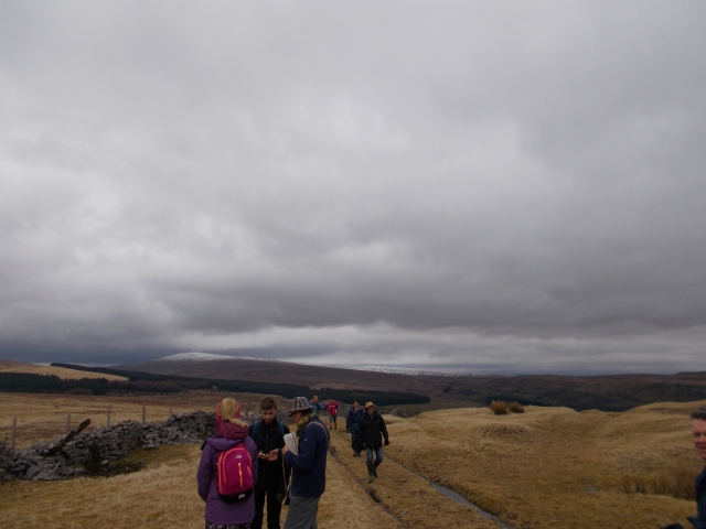Saturday the rain hadn't abated so a decision was made to hold off the start of the walk, that saved us as it was then dry for the rest of the day after the half-hour delay. We headed up the Afon Mellte to Ystradfellte where we came across the access point to the pot-holing caves. After a quick check on food times in the pub in Ystradfellte, we carried on the planned walk, a little less pace than expected because of conditions under foot. After a few challenging climbs we took the road to the remains of Castle Coch. A scout round the mound was all that could be gleaned. Next another climb to the cairns above Forest Fawr where the snow-capped Brecon hills provided plenty of scenic memories. Back down the hill to a welcome stop at the pub with a roaring fire, lunch was much appreciated. The whereabouts of the geo-cachers Martina, Daniel and Rachael being long passed the agreed time to meet needed a trip up the hill for a signal, once contacted we made tracks back, some more friendly than others. At the bunkhouse a de-brief of the geo-cachers revealed why we never saw them as they had ventured into marshland to be rescued by quad bikes and further trouble led to the offer of a lift from the local farmer. Another night of more good friendly banter prevailed.