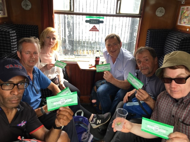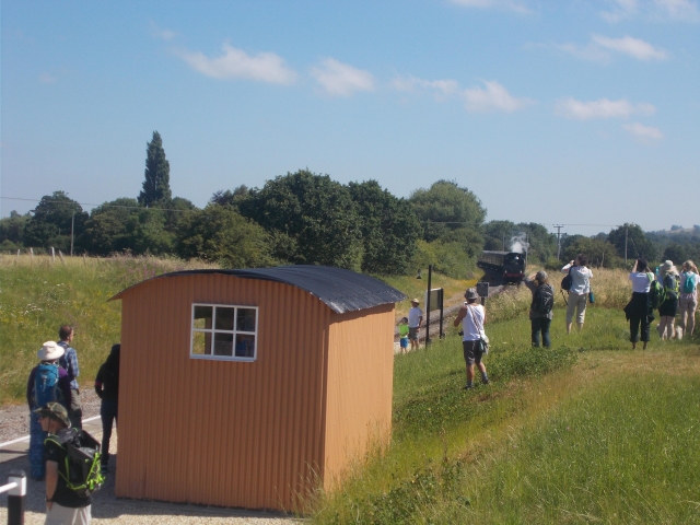9 of us met at Princes Risborough for the steam railway walk. The connection between Chinnor steam railway and national rail network was just opened last month. After breakfast baps at the Café de la Gare we climbed aboard the heritage carriages for the scenic journey passing the Chiltern hamlets and cricket pitch on the way. At Chinnor we alighted from the steam train and walked to join the Ridgeway National Trail. On such a sunny day there were great views of the Oxfordshire Plain below. We reached the sleepy village of Bledlow and after touring the famous Lyde Gardens we had a leisurely lunch at the Lions pub watching the steam train pass back and forth in front of our tables.