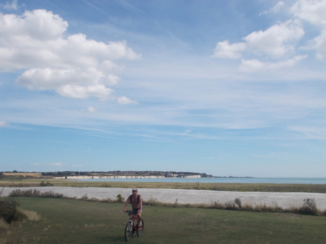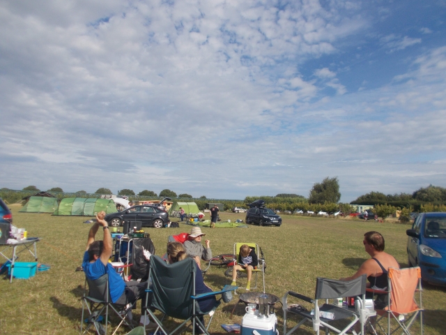 On Saturday we awoke to glorious blue skies and breakfast cooked by Gilly and Martina. We set off on the long coastal cycle ride from Deal to North Foreland (Botany Bay). The sunny weather meant that all the beaches and resorts along the coast were lively. Sustrans route 1 was well signposted; we stopped at Pegwell Bay for the Viking ship and the beach café. Climbing to Ramsgate the views over the yachting marina were stunning, the clear skies also affording the coast of France (25 miles away) to be easily visible. Arrival at Broadstairs we had to park the bikes as the town was choc-full for the annual folk festival. Bands were performing at the bandstand, the promenade walk and in the terrace gardens. We had our picnic on the beach whilst Daniel took over some sand castles kindly prepared by other children. Leo led Gilly and Coogee on an extended ride taking in the very scenic Botany Bay with its imposing chalk stacks and white cliffs. The intrepid trio undertook some cave exploration and beach games before cycling back to camp. We had a very late barbecue (long story) with the campfire roaring into the early hours.