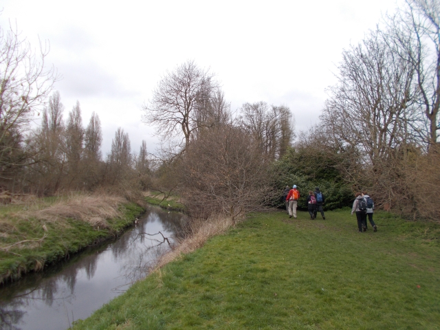 Just one elusive celandine joined 17 of us on the canals and celandine walk this Sunday. Starting in Uxbridge we made good steady progress along the Grand Union Canal until we joined the River Pinn at West Drayton. Upon reaching the fields at the start of the Celandine Route we were confronted by a ginormous red fairground building that had been literally put on top of the path. Undeterred I led the group through the buildings and lorries of the fairground that seemed to have sprung from nowhere. We then followed the route through Hillingdon, Ickenham, Ruislip, Eastcote finally ending up at Daisy's in Pinner where we separated into the cafe remainers and the pub leavers. 13.28 miles, no rain, only moderate mud, 2 hitchhikers joined us at Ickenham when we stopped for lunch and 1 old group member turned up at the pub to get into the sub-group photo!