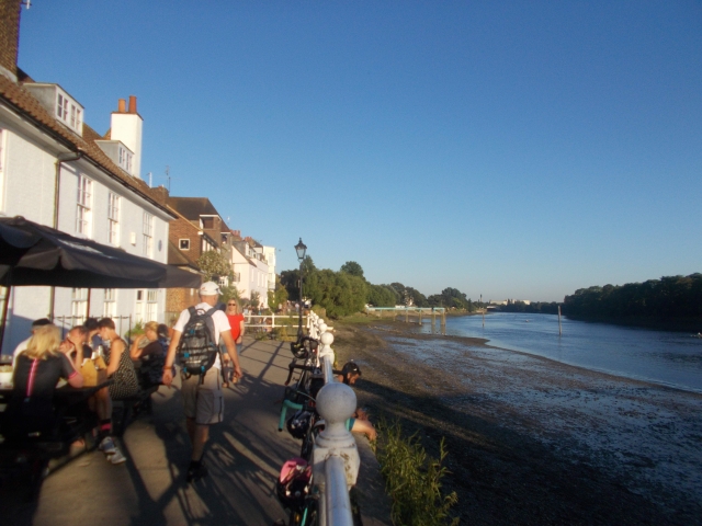 We departed then to cycle across the famous Hackney Marshes, seeing football matches taking place at the largest sports field in the country. Next stop was the Olympic Park, lots of noise from the stadium where West Ham were playing Manchester City. Then onto the historic 18th century Three Mills Island and finally Limehouse as the Lea meets the Thames. We enjoyed some riverside drinks again at the Prospect Of Whitby watching the many vessels glide by. New cyclist Diane joined regulars, Brian, Nick, Coogie and Kerry.