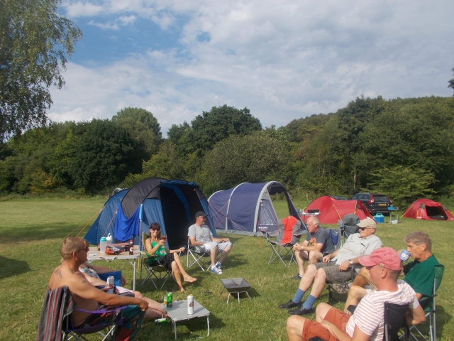 Our first camping trip of the year was another scorchio weekend in the Garden of England. Fallows Fields is situated within an orchard and our pitches were bordered by rows of apple trees. Glamping bell tents were everywhere on the site, we provided our own innovation with three inflatable tents. Nick was first to pitch and exclaimed "it's fully erect within seconds". Brian led the early arrivals on a walk around the perfectly preserved town of Sandwich. We followed the route of the town walls, passing many half-timbered houses and medieval churches. Maria pointed out a manor house featured in a recent reality television show. After fish and chips along the quayside we headed back to site to discover Martina pulling out of her pocket a conveniently pocket-size fire pit. Martina assembled the many poles and the netting to reveal a perfect fire pit inspired by Q. Over wine around the campfire various anecdotes were recounted: Dawn of her episode in a charity shop; Dan of his dance display at the Gents; and George of his time at a sauna in Cairo.