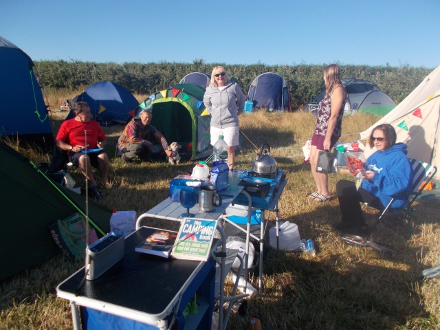 The early morning blazing sun and Tony Blackburn awoke us early for mugs of tea and bacon sarnies. Malcolm set off on his marathon cycle ride, from Sandwich to north Kent and back along the Viking Trail. The others did the walk from Pegwell Bay to Broadstairs along the coastal path. This route is mainly on the clifftop with panoramic views throughout. As the blue sky was so clear France was easily seen as well as the wind farms out to sea. We stopped for cooling drinks at the Edwardian Royal Pavilion at Ramsgate, finding tables on the balcony terrace looking down over the sandy beach and the yacht marina. The route continued north until we descended to Dumpton Bay for ice creams on the beach. At Broadstairs the Viking Bay beach was crowded with sun bathers and swimmers. After drinks at a beach bar we headed back to site. Diane, Rachael and Jan prepared a sumptuous barbecue before Daniel received his birthday cake. Around the campfire Coogee once again provided the music on his ukulele with Jan, Martina and Diane leading a rousing version of "You've lost that loving feeling".