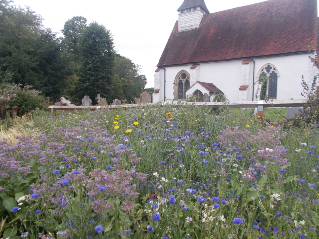 Six walkers met on a warm evening at Northolt village green. Our first visit was St Mary's, the 14th century church on the hill. We then explored the site of Northolt Manor with moat intact. In Belle Vue park, Sarah pointed out the borage wild flowers. There are new wild flower corridors across the meadows on the park, created to assist the survival of wild bees. We joined the Grand Union Canal and continued to the footbridge. Currently fenced off, Pauline showed the rest how to squeeze through a gap in the fence. At Northala we ascended the highest mound for panoramic views to Canary Wharf, Wembley Arch and Heathrow. By chance we met Ian and Chrissie, former members, on their own perambulation. After exchanging news the group returned to the village for drinks at the reopened Crown.