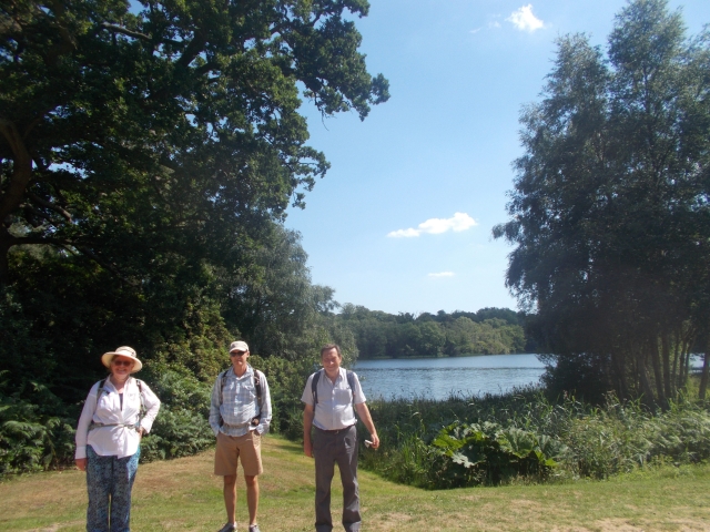 Our walk continued around the lakes of Virginia Water, passing the obelisks and totem pole. We had our picnic by the lakeside with Rob P bringing out his supply of cold drinks thanks to flasks and cool bags. We then explored the Valley Gardens with its rich mix of trees and vegetation. As the afternoon temperature was well over 30 degrees our speed dropped, luckily more ice cream kiosks were around in the parklands. Our route back to Egham was a first time attempt via bridleways and footpaths which proved rewarding in terms of scenery and varied landscape.