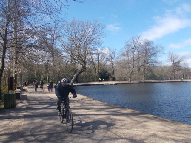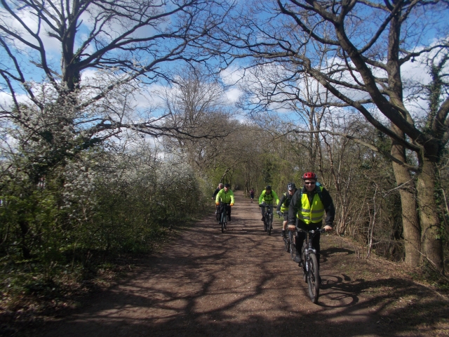 Easter Monday saw nine cyclists assemble for the first cycle ride of the year. We departed the Rusty Bike cafandeacute; and joined the Grand Union Canal south. Our route then took in Systran's route 61 through farmlands and country estates of Iver and Richings Park. Derek tested his new electric cycle on the hills, sometimes even waiting for Prem. We made it to the elegant, landscaped grounds of Langley Park where we encountered Victoria Meldrew on a path. Our lunch stop was at the lakeside cafandeacute; in Black Park. New recruits Muneer and Simon debated the merits of carbon fibre frames with Kerry and Coogee.