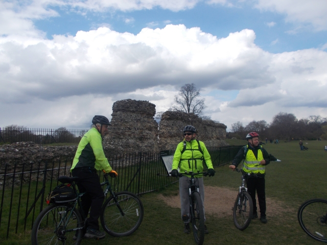 Five cyclists met at the Aquadrome cafe for the second ride this year. We used Sustrans route 61, mainly traffic-free all the way to St Albans. First section was the Ebury Way around Watford then parklands and riverside tracks along the River Ver. Among the many allotments and scooter / cycle skate parks we were struck by one notable mansion, the arts and crafts-style villa with the sporting motifs around the facade. At St Albans we climbed to the impressive cathedral dominating the historic town. We had our picnic in the Abbey gardens, missing out on Coogee's gobstoppers for a change. We then explored the Roman walls and remains. In the Abbey parklands two cricket matches were taking place.