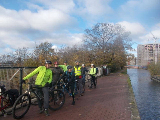 Nine cyclists met on a sunny bracing morning at Northala café. After bacon butties we set off along the Grand Union Canal eastwards. The canalside trees were still full of autumn colour and a heron was spotted within the barges. We crossed the aqueduct at Park Royal noting some anglers along the route. At Old Oak we cycled under the new conveyor belt bridge taking the spoil from the HS2 tunnels. From the bridge we took in the vast Old Oak Common site, the new HS2 and Crossrail stations still at foundation stage. We left the canal to do a tour of Wormwood Scrubs, the parkland covered with football pitches. Our coffee break was at the stadium where we met by chance the Ealing Cycle Group travelling east.