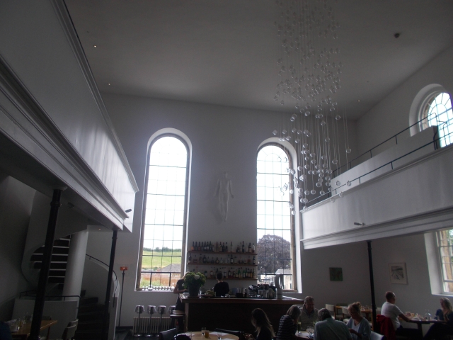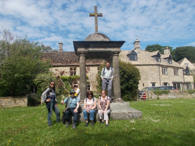 Saturday was a 10 mile walk featuring four classic Cotswold stone villages: Coln St Aldwyn, Quenington, Arlington and Bibury. An early coffee stop at Coln village stores where lots of other walkers and cyclists joined us on the village green. The morning section passing large stone farmhouses and riverside meadows. We happened upon a collection of art works (mostly forged together horseshoes) at a large farm. We reached Arlington Row, described as the "Apotheosis of rustic Cotswold architecture". The row of former weavers' cottages was busy with visitors. Our lunch was at the waterside café of Arlington Trout Farm, Christine and Janet finding the trout baps awfully nice. Newbies Angela, Kevin and Esther impressed the large wedding party, in the garden of the Swan hotel, with their matching Berghaus rucksacks. We continued through Bibury, passing impressive tithe barns, Manor and Dovecot. Arriving back at Coln the afternoon sun was getting fiercer so we had post-walk cold drinks on the terraced gardens of the 17th century New Inn. In the evening most dined at the Bear Inn, yet another Georgian coaching inn, just off the wide marketplace. The party continued till early hours at the hostel lounge, Tim B and Nick impressing all with their Spitfire and canoeing yarns.