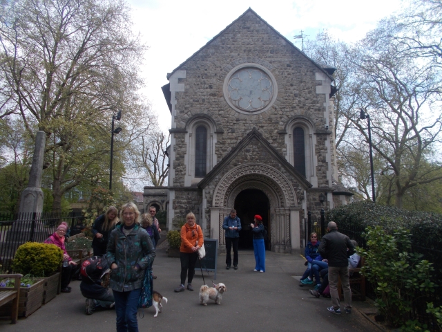 A larger than expected group assembled on a sunny morning on the Starbucks coffee shop terrace by the Regents Canal. After coffees and welcome backs to the prodigals we set off. Using the excellent David Fathers guidebook our route followed the course of the Fleet through Camden to arrive at St Pancras Old Church. A Christian site since the 3rd century we found the grave of Mary Wollenscroft (flowers left as the day before was the anniversary of her birth in 1759). We took in the Eurostar terminal (river runs underneath) and several alleyways through the Gray's Inn quarter.