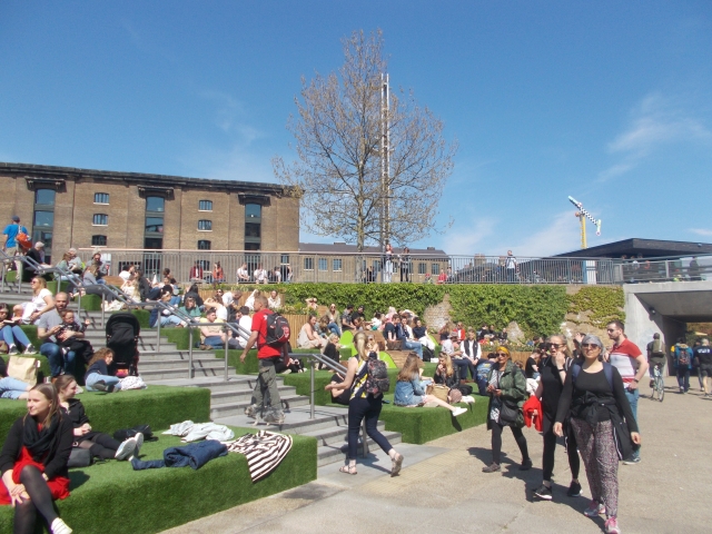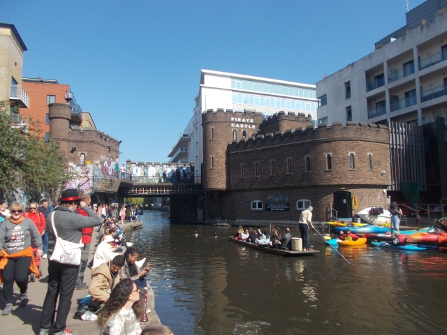 Nine seasoned walkers turned up for the canal walk from Mile End to Little Venice. The weather was the star of the show, bright sunshine all day long. This was both a blessing and a curse, as there were many like-minded people along the canal: walkers, cyclists and those just happy to sit on the canal banks. We crossed the aptly named Banana Bridge (painted yellow) to get to the canal. While on the bridge we could see the Queen Elisabeth Olympic Park in the distance. We pondered a while over the Arcelor Mittal Orbit Tower, apparently it has a nickname but no-one could remember it. We set out at a steady pace. Our first stop was a scheduled toilet break in Victoria Park. Toilet queues not too bad, however the cafe queue was considerable and we decided to move on.