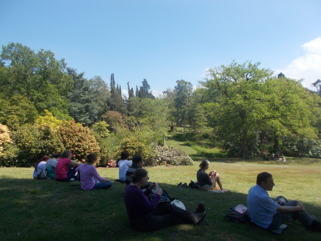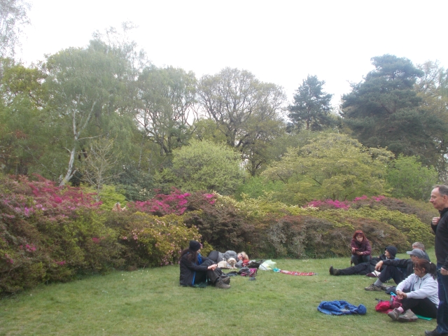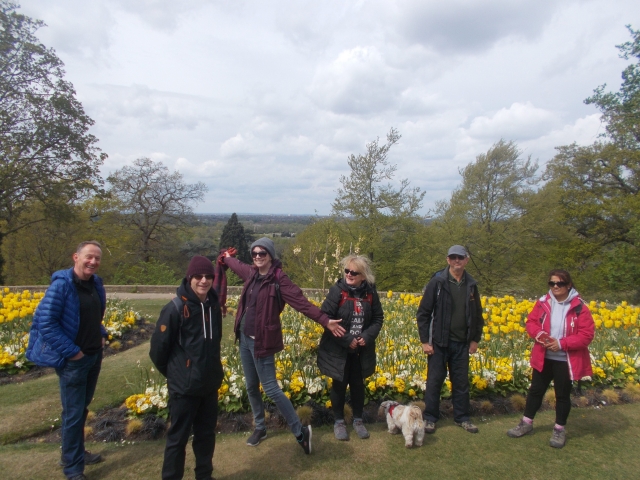 A mixture of newbies, regulars and surprise guests met at Tide Tables cafandeacute; terrace by Richmond Bridge. Rob W and Mona were passing through and chatted to us over coffee and pastries. Our route followed the Thames Path to Petersham Village. We admired the many mansions in this historic hamlet, including the corner villa reputedly that of Tommy Steele. Into Richmond Park we climbed to Pembroke Lodge (lots of Fallow Deer on the ascent). We climbed King Henrys Mount to view St Pauls through the telescope and took in great views over the Thames Valley. Mona's date cake was shared out as we took in the vibrant display of tulips. Rob P guided us through the park to reach Isabella Plantation. We strolled around the kaleidoscopic display of azaleas on display in this delightful enclosure; pink, red and purple were the dominant colours. We had our picnic by the lake, Carole and David explaining the history of the park and its features.