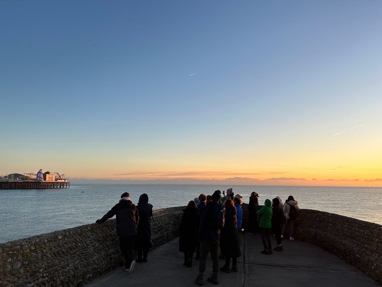 Saturday's walk leader planned the walk to start at 9:15 knowing that normally this means that we would actually leave at 9:30. Not this group of walkers - everyone had had breakfast and was ready on time. Our walk took us along the seafront in the opposite direction to the previous evening's walk, for a mile and half, at pace. Yhis must have had something to do with the freezing temperature with a clear blue sky and bright sunshine. After leaving the coast we headed gently uphill for another mile or so, taking in the fantastic views of the South Downs and Brighton in the distance behind us. Our route followed the Brighton race course so navigation proved not to be too difficult until we were less than 2 miles from our final destination. Unfortunately as we were making our way along the footpath it was blocked in several places by fallen trees. Battling on, we finally arrived at the Brighton and Hove stadium where a short walk took us into the small village of Falmer where we had lunch by the pond and visited the local church. We then made our way to the local pub for well-deserved drinks before taking the bus back to the hostel in plenty of time to catch the starling murmuration. Making our way down to the beach we waited patiently for the birds to arrive in small groups, which formed into a much larger group of thousands of birds, putting on a display, rapidly changing direction against another fantastic sunset before they dived under the pier, disappearing for the night. Unfortunately one of the group had felt unwell and had to leave for home early. They had they use of a single room and so Top Bunk Humay was there like a flash to fill the vacant room.