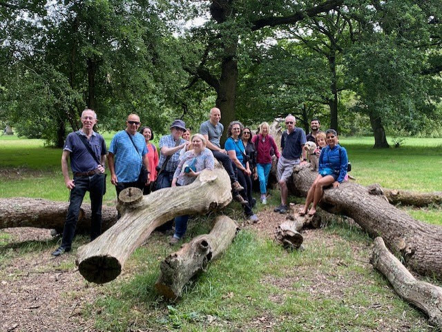 9 walkers risked the rainy weather and likely quagmire of Ruislip Woods. The walk started by welcoming a new member Amin on his first walk of many. We walked through the suburban streets with neatly tended gardens, past King's College playing fields, happily chatting as we went. As we neared the woods, everyone was gifted with free pastries and bananas from an angel in a flat-backed truck. A bit dazed by this, we entered the woods, fuelled by sugar and good humour. The route through was very treacherous and made progress slow. The weather held up well and it was easy to see the beautiful magic of the woods. Eventually we followed the railway line and paths until we came across the slightly incongruous beach where Summer Holiday was filmed with its pirate ship and palm trees. We stopped for a chat, admiring the swans and talking about the bar colony that is resident in the woods. We then made our way back through the swamp to a well-earned cuppa and lunch.