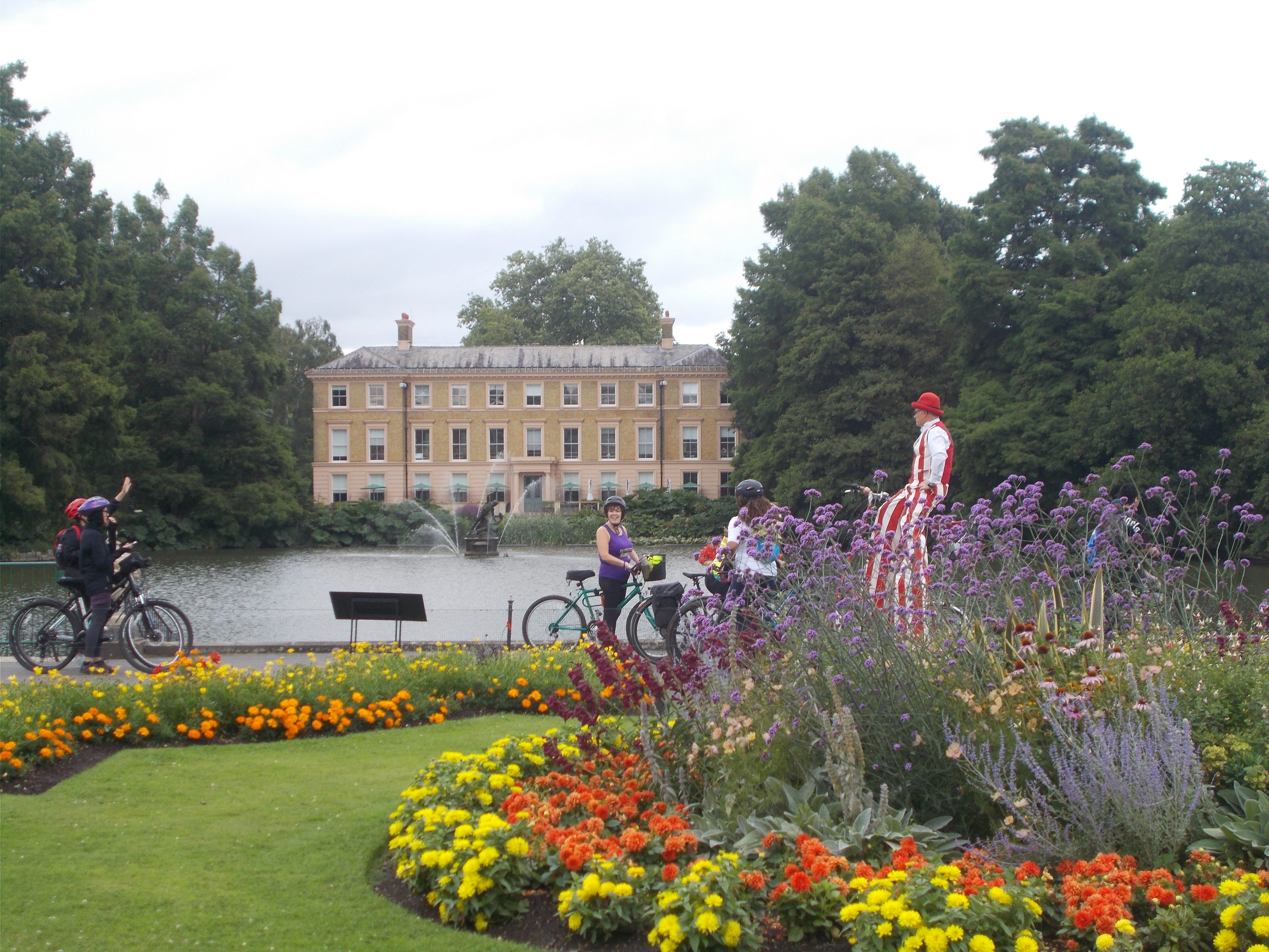Our return route took us through the Middlesex filter beds that were built in the 1800's to provide clean water for London, following a national cholera outbreak. Cycling south on the Lea Navigation we passed Here East, Stratford's Silicon Valley, and some riders zigzagged up to a footbridge and across to the Bohemian 'Hackney Wick', bristling with artisan studios. The footbridge over the A12 connected directly to Victoria Park, Britain's oldest public park, where we encountered BMXers and skateboarders on scary-looking pipes and ramps that were beyond even our very own extreme sporter, Nick. Back on our own wheels, we then hit upon the Bandstand, a latter-day meeting point for the suffragettes. After Victoria Park we joined and biked along the Regents Canal as far as the Mile End climbing wall and took the new crossing into Meath Gardens, housing estates and Cambridge Heath Road, arriving at the infamous Blind Beggar pub at 3:45pm. There Lisa negotiated all our bikes through the bar to the security of the beer garden. It was from there in 1966 that Ronnie Kray shot dead seated Georg Cornell and the bullet hole is still visible today in the wall by the TV monitor.
