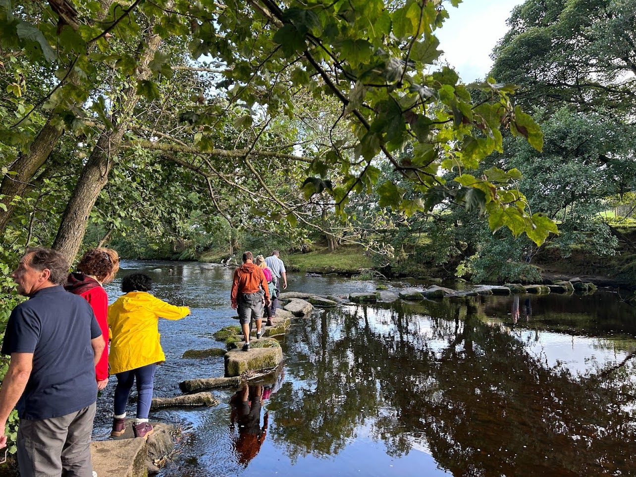 Our early autumn break took place in the Peak District National Park at the Derbyshire town of Hathersage. The EMR conductor (purple uniform matching the train livery) directed us to the Sheffield Tap to spend the time waiting for the connection. The Tap is a recreated Victorian station in the Grecian splendours of Sheffield Station, and we supped on some local brews admiring the fountains and steel artwork celebrating Sheffield industry. Twenty-two of us gathered in glorious sunshine at the hostel and set off on the afternoon Derwent Valley Walk. Sandra welcomed her friends Kevin and Isobel (locals and very enthusiastic hikers and climbers) as first surprise guests. We skipped over the stepping stones including one leap of faith over a gap. The route took in the meadows, criss-crossed by dry stone walls, sheep gambolling in the sunshine. Sally led us to the free drinks and nibbles at the village pub (Aperol Spritz promotion), before our sumptuous curry meal perfectly hosted by Diane as always.
