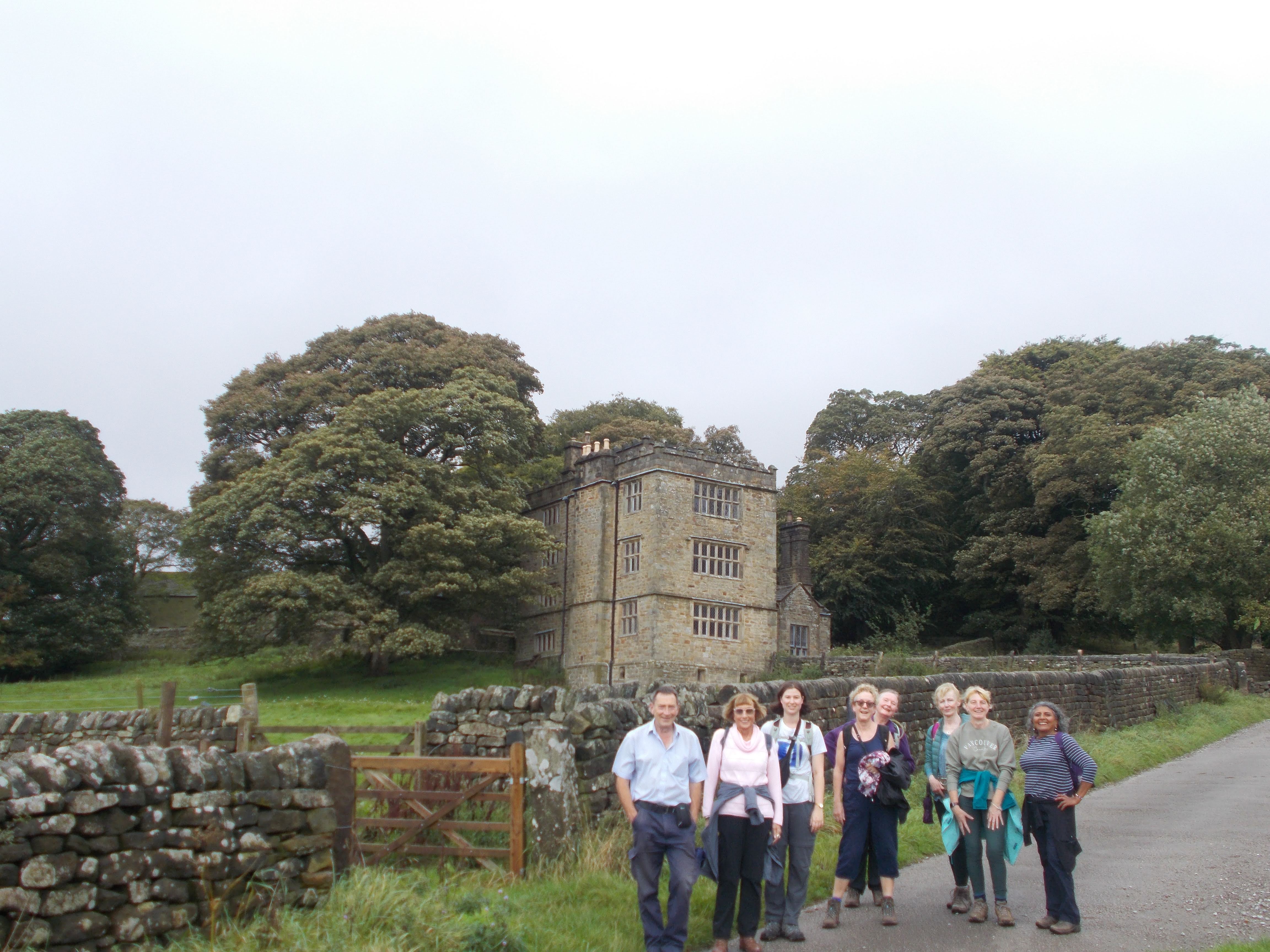 At the full English breakfast, we bonded with Nicholas, another surprise guest who had lent us (unknowingly) some milk for our tea on Friday. He is a very generous chap and announced, "no problem, at least you left me some for myself". All three surprise guests joined us for the 10-mile walk across the high gritstone edges and vast moorlands above the valley. Brian led the route which climbed from Hathersage and passed several stone manors and shooting lodges. We stopped at the towering granite tors, and found some carved millstones abandoned alongside the huge rock formations. After an unexpected ice cream break we climbed up the National Trust Longshaw estate. Tea and buns for all was just the ticket with great views across the Dark Peaks. New Kevin then led us along the White Edge path high above the Derwent valley, the moorlands extending for miles in each direction. We had our picnic at a rock formation with views and a helicopter circling above. We continued along the edge trail and then descended towards the valley. Reaching Calver we had a long wait for the bus so spent the time at the Eyre Arms where Diane led the chorus with "You'll never walk alone" on the jukebox. Malcolm set off on the extra 5-mile trek along the river while the rest took over the local bus. Back at base the Bakewell bunch told us of their town walk, the society wedding they gate-crashed and the livestock market where they nearly bid for a heifer. Our evening meal was at Little John Inn where we enjoyed a tip-top Yorkshire meal and were entertained by Jeremy's tales of crashing a tank during officer training. Back at base it was chocolate cake time, shared with Nicholas to repay his generosity with his milk.