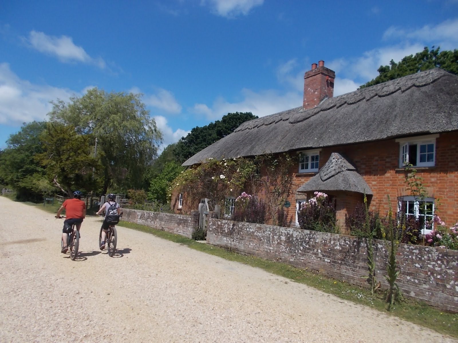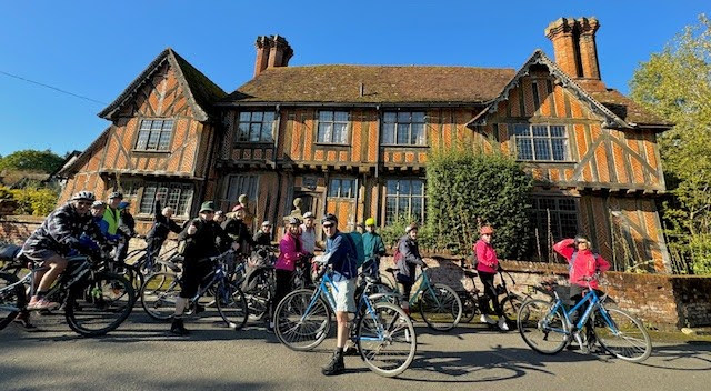 Then to the lunch stop at Hampden Arms. As only 20 minutes planned stop due to the clock change we made use of facilities, ate outside and moved on. Leaving the pub, we passed the infamous Bryant's Bottom sign; we giggled. A few muddy patches, a few friendly horses, to the 3 inclines, now in single file due to the farmer's newly fenced areas, but we were lucky to see a family of deer watching us. Beautiful to see. Back by Prestwood, we continued through more wooded area and National Cycle Path. Some beautiful hydrangeas outside houses. Final road down to what was Missenden Abbey, now conference rooms.