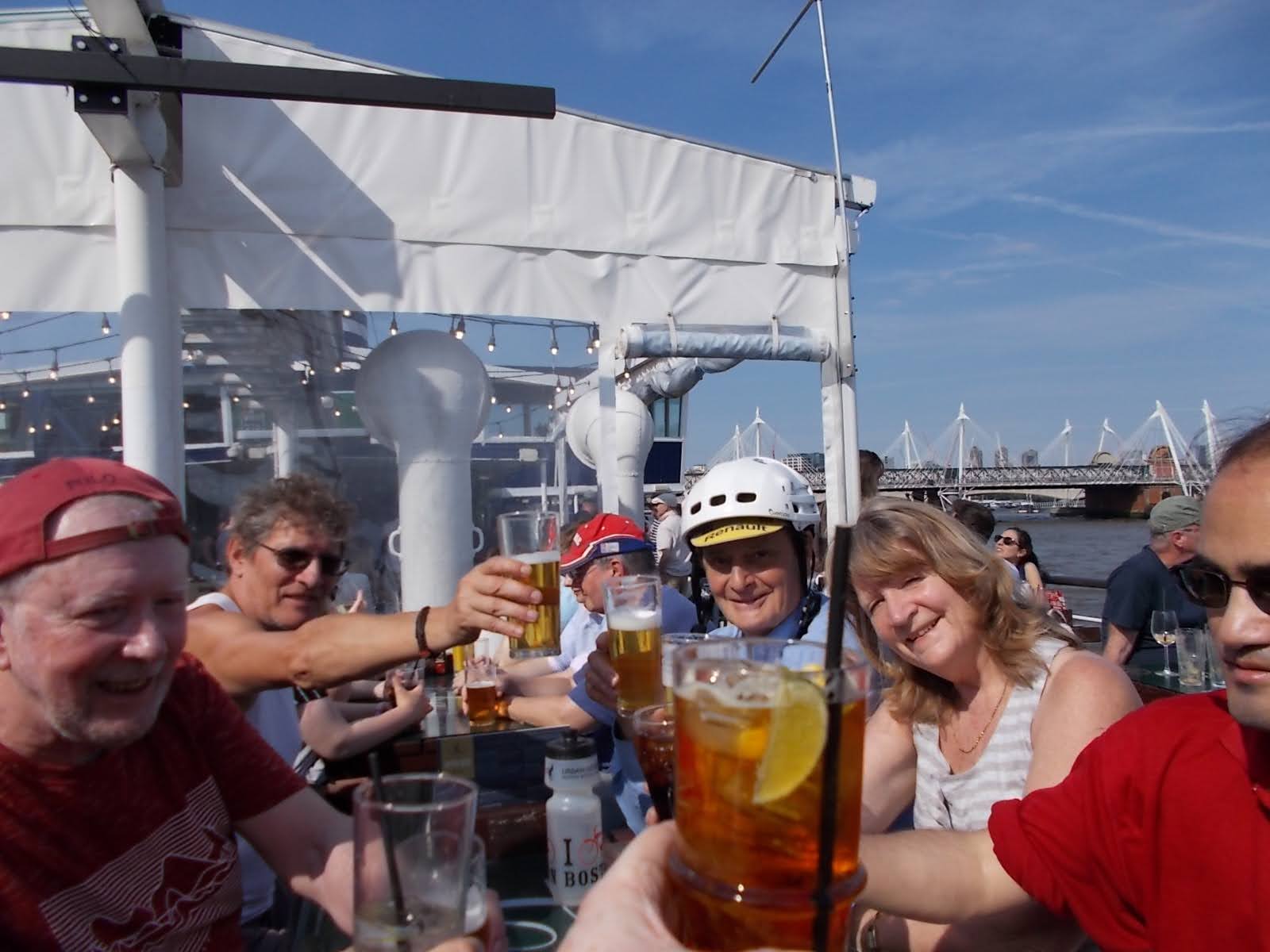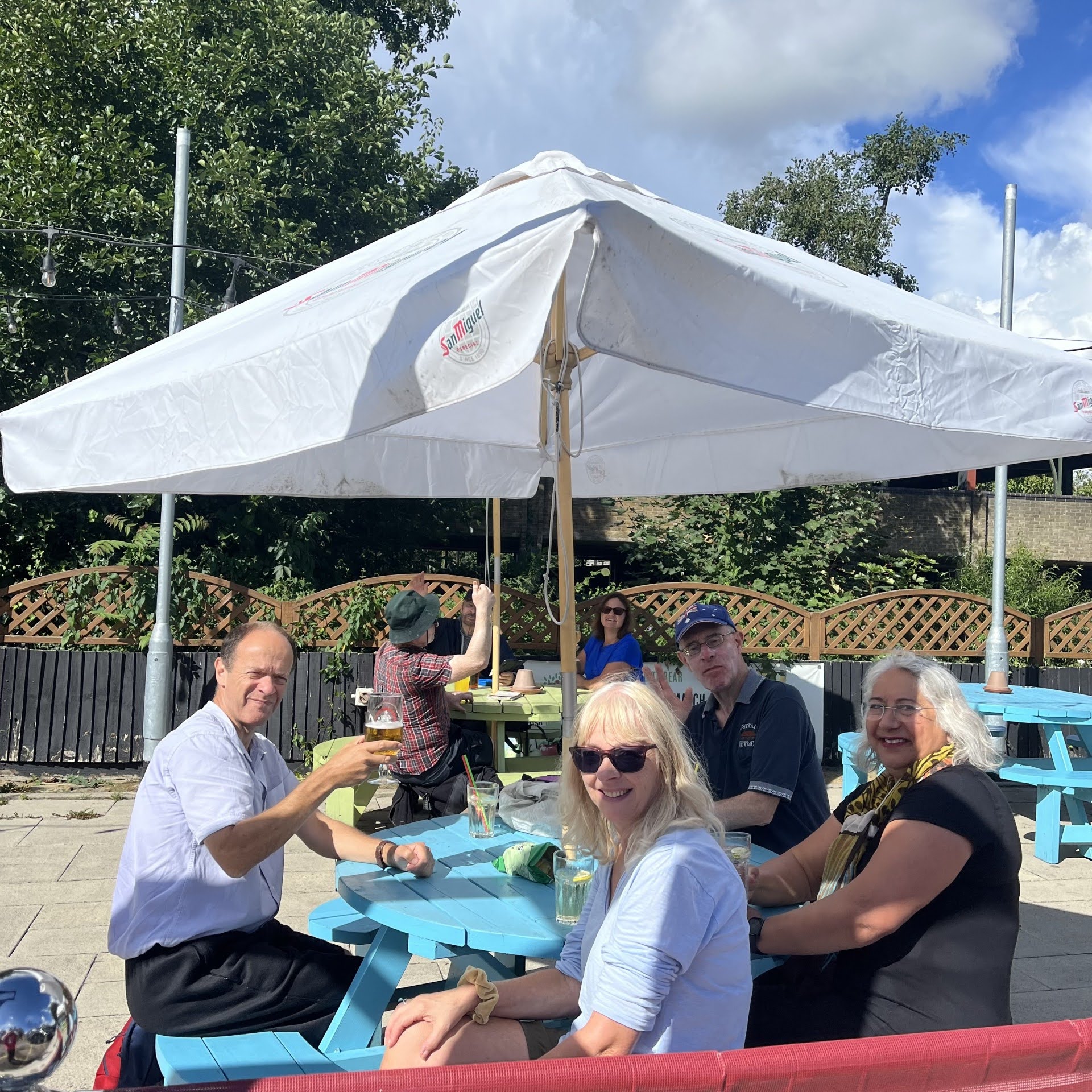 We then arrived at Blondin Park, home of the Brentford Festival. The park was packed on such a sunny day. We had our picnic watching the music acts; "the jam doughnuts are on me" announced Brian. We explored the many stalls and displays with the Ealing Cyclists having a very useful repairs service which Derek and Prem made use of. Then just the ticket to jump on the Routemaster for a free ride on the vintage omnibus around Ealing, Hanwell and Brentford. We were on the top deck (smokers haven in the good old days) and watched the commuters on Uxbridge Road look in amazement as the vintage vehicle stopped at all bus stops to allow anyone to jump on. Back at the park we did a Tebbit and cycled to the riverside. First stop was St Pauls Church which is a typical stone-built Victorian church on the outside, whereas inside it is a neon-lit community church (basketball hoop and mezzanine lounge areas) with its own café. We admired the artwork on display before enjoying some rather splendid cakes at this unique church. Then we cycled to Johnsons Island, an artistic haven reached via a narrow alley and footbridge. It was a very rare chance to explore this delightful island, full of artist huts and cabins all linked by hidden passageways and precariously narrow and steep spiral stairs. We were offered Japanese liquor wine at the hat studios; "it's awfully nice" exclaimed Rob. The most unusual work was a Harry and Meghan updating of "American Gothic". Then to Watermans Park via the excellent just opened cycle path for music in the park. Just time to pop into the hidden gem of the Weir pub and its charming riverside garden for Pimms galore after a packed cycle ride in sunny Brentford.