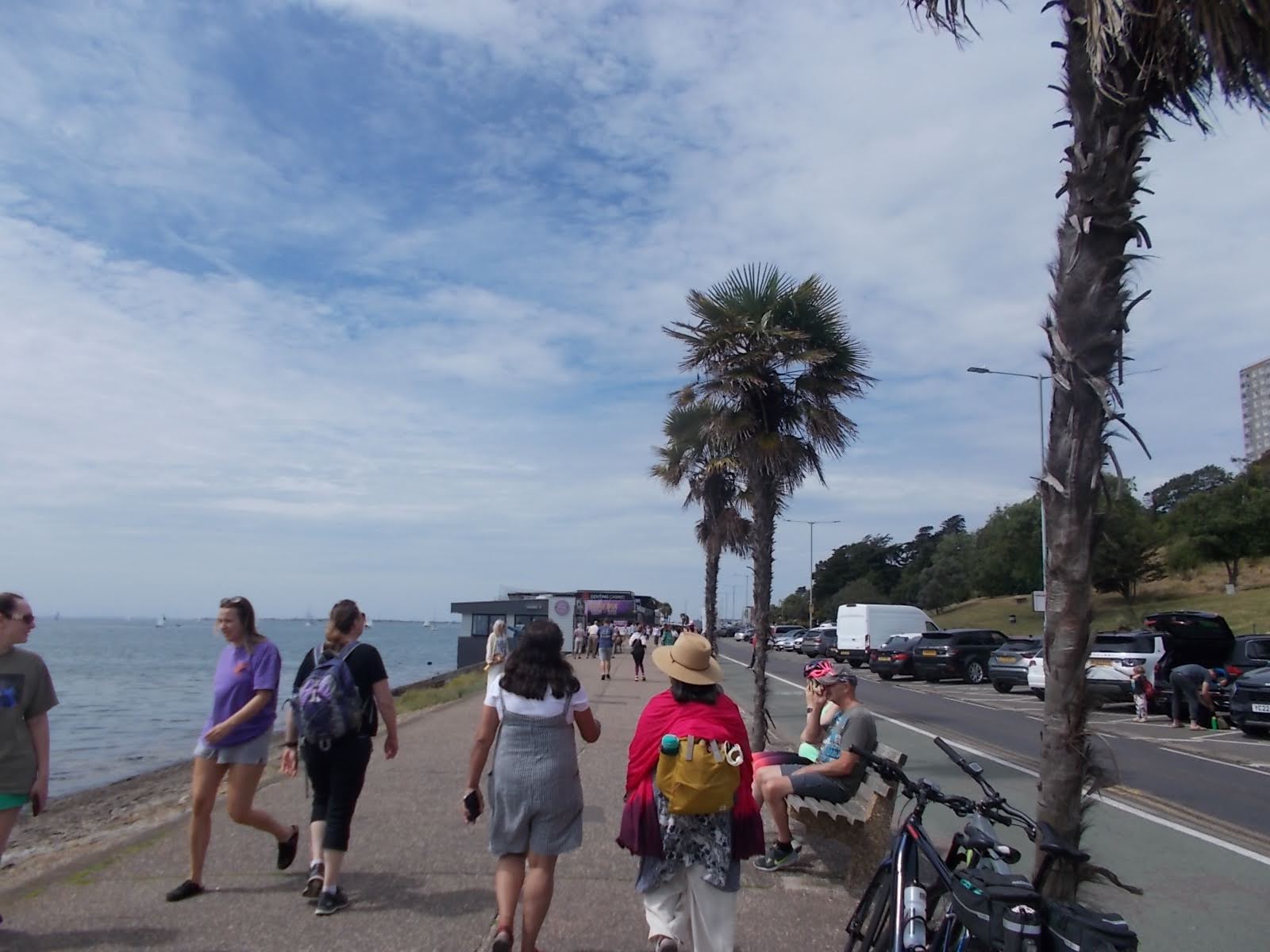 We had lunch after another summit, taking in the crowds struggling up the next hill. Ice creams of course at Birling Gap, the National Trust tea rooms packed with walkers. We climbed to Beachy Head just above the lighthouse, keeping clear of the precarious cliff edge. Then the long descent to Eastbourne, the gardens and esplanade as elegant as ever. Serendipity rewarded us at the art deco bandstand with a rehearsal for the next day's concert. Then the final leg to the pier for fish and chips and a Northern Soul band in the Grand Ballroom.
