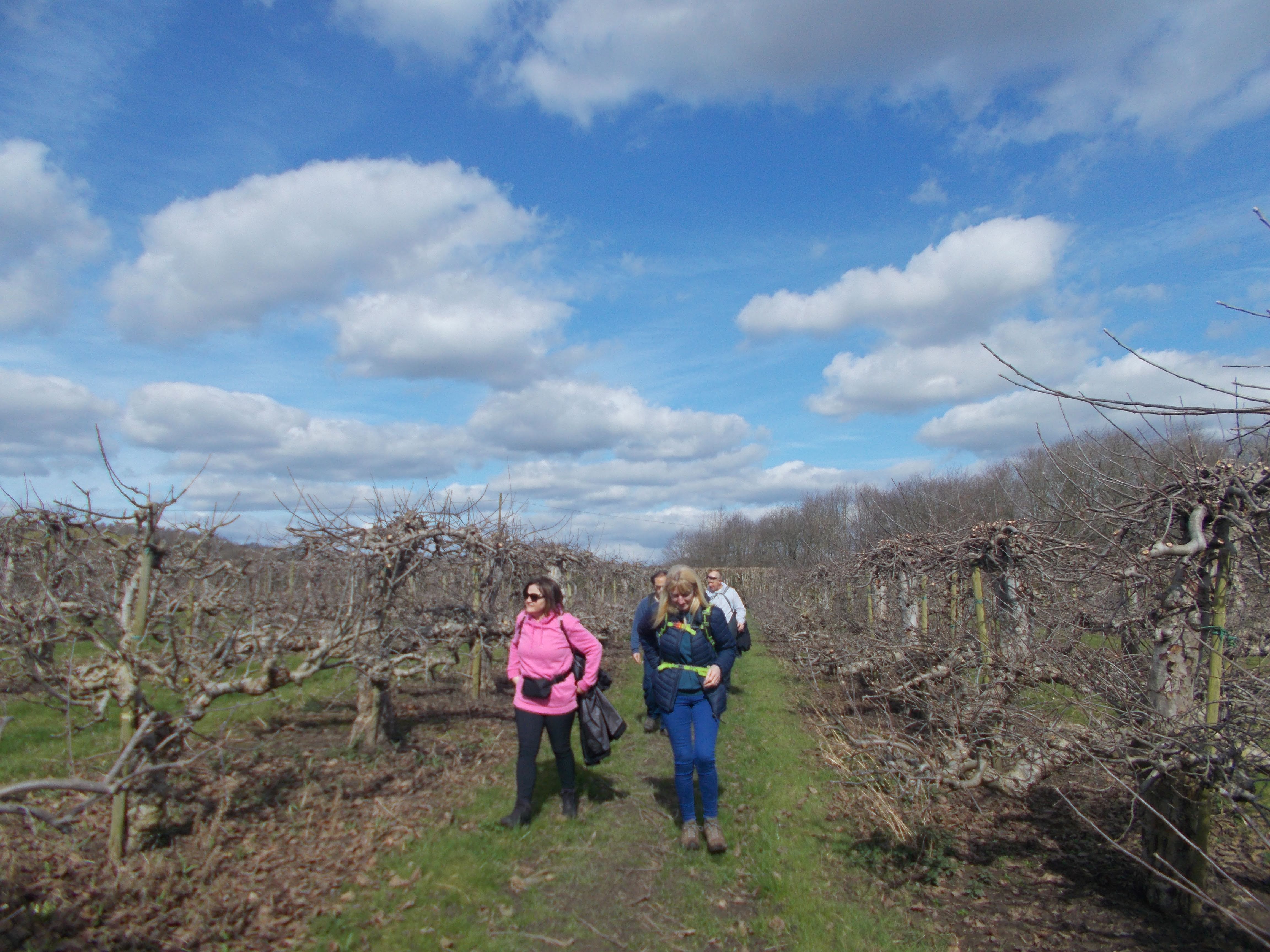 On a fine sunny morning seven alighted from the train at Borough Green. Our walk was through the orchards and woods of the garden of England. We viewed several Oast houses unique to this region, now converted to family homes. After crossing an apple orchard, we gave way to allow horse riders to pass with a dog following them. However, the collie dog, Kelly, then joined us on the walk, no owner within sight. We carried on with Kelly running ahead and knowing all the paths. We reached the timeless village of Plaxtol, very picturesque with shiplap clad cottages, memorial cross and Cromwellian church. The church had provided refreshments in the nave, so we had a coffee break there whilst waiting for Kelly's owners to arrive. They explained that Kelly routinely followed the riders from the farm and knew all the routes. We then headed south via the Japanese garden and manor at Fairlawn. We arrived at the perfectly preserved medieval moated manor house of Ightham Mote. We had lunch at the National Trust tearoom (where the latecomer, the usual one, caught up).
