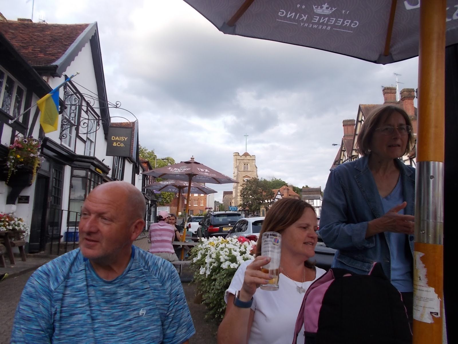 We sat outdoors, surrounded by fields of corn, and cows. We were welcomed by the owner, her husband and grandmother. We thoroughly enjoyed the fresh coffee, tea and home baked cakes. But we had to carry on, heading towards Woodcock Hill and White Hill. We stopped by the pond for a quick lunch stop, followed by a lovely walk through Moor Park, stopping to watch some golfers. We finally arrived at the White Bear for well-earned drinks, sitting outside in the sun and enjoying our cold drinks. The invisible man finally appeared. Some stayed longer and enjoyed a meal.