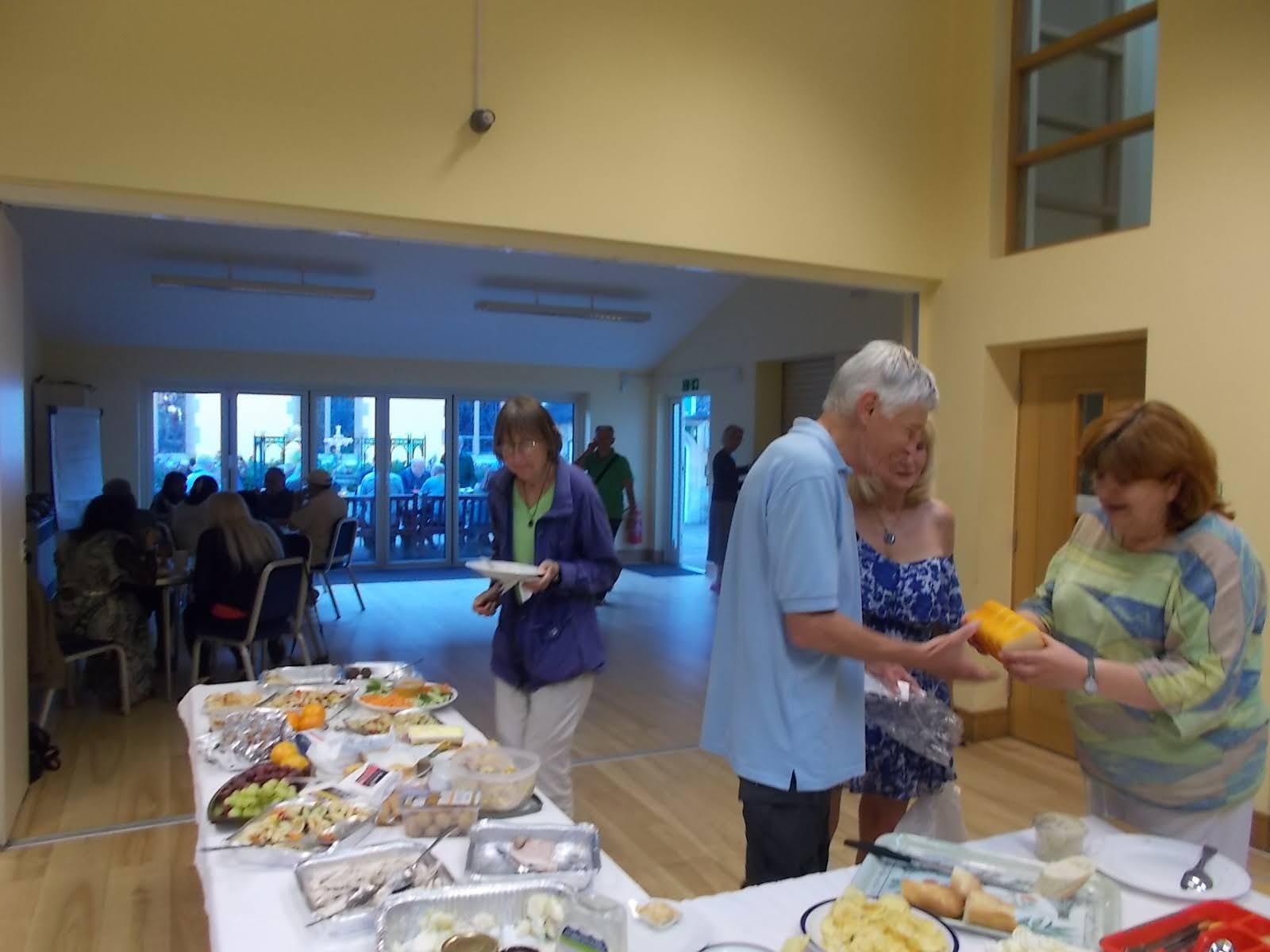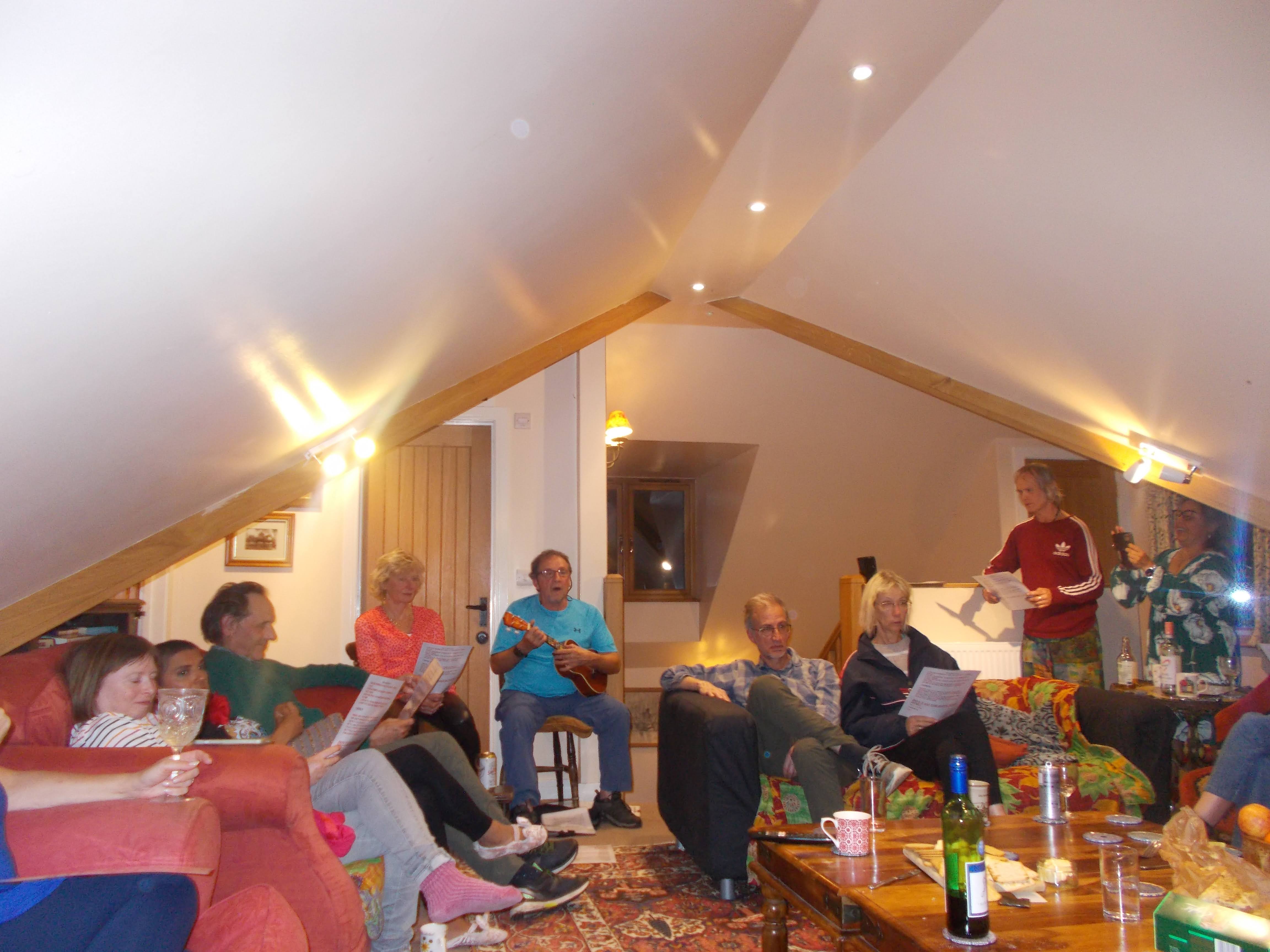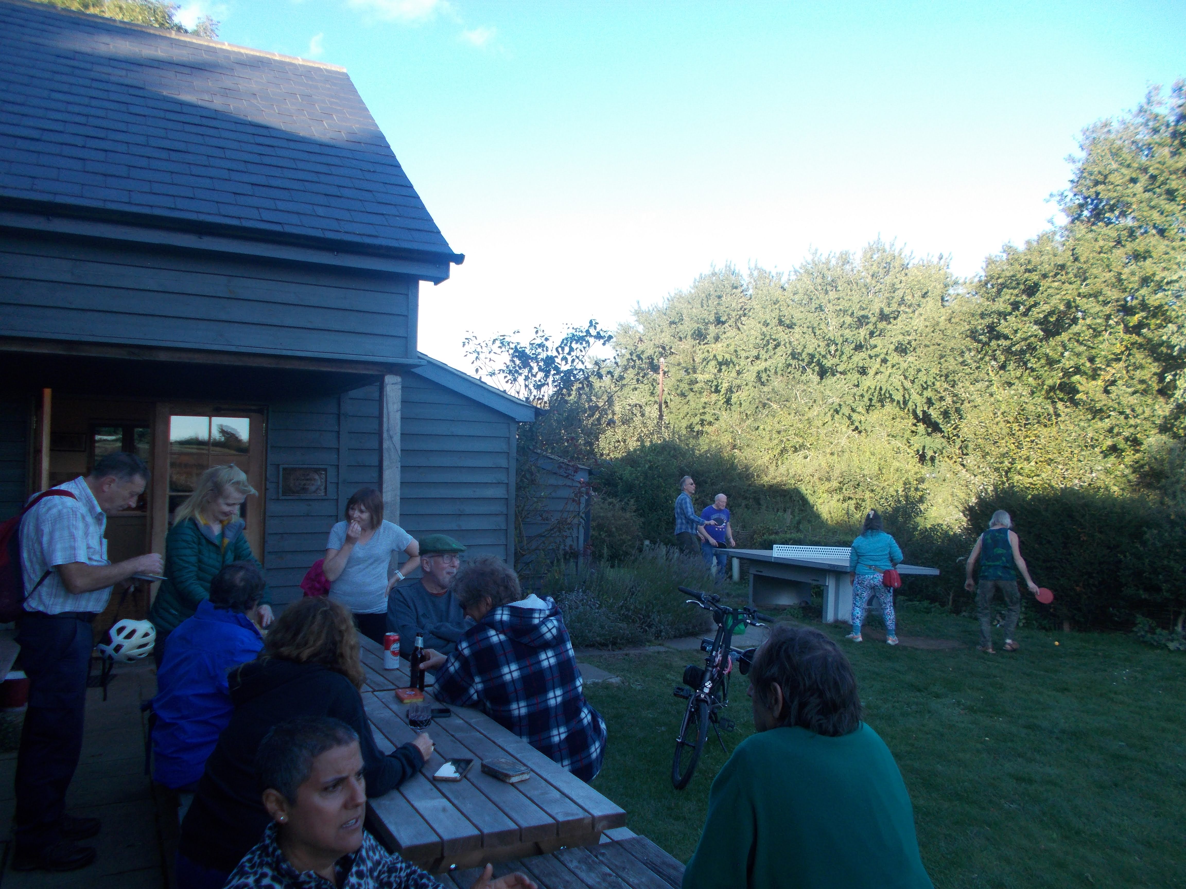Saturday saw us enjoy glorious sunshine again with many breakfasting on the picnic tables in the garden. Louise and Kevin led the walk with the non-cyclists, following footpaths to Lavenham where they coincided with the cyclists. Twenty-two cyclists (using the unique offer of free cycles provided by the venue) set off on the 25-mile tour of the Suffolk Wool Towns. This region was the richest area of England in the era prior to the Industrial Revolution with its town and village parading its wealth with majestic churches and half-timbered manors. We stopped at Brent Eleigh, Preston St Mary before arriving at Lavenham, perhaps the finest Wool Town. It boasts of over 300 listed buildings, its half-timbered manors dating back to the 15th century. We had coffee at the marketplace and then explored the town including the guildhall and superb parish church. Our route continued, passing many thatched cottages painted in the mellow salmon pink of Suffolk. This region is perfect for cycling due to its gently undulating landscape and absence of traffic on the quiet country lanes. Suddenly one little chap had a mishap, and panicked before he heard a voice he recognised: "Jump up Dean, we'll soon be flying, I can go just as fast with two". Our next villages were Lindsey, Chelsworth and Monks Eligh with the highlight being the picture postcard village of Kersey. After climbing to the church on the hill we had well deserved drinks at the 15th century pub by the ford. Walkers and cyclists gathered back at Milden for some rather splendid Victoria Sponge, and lemon drizzle cupcakes (baked by Louise and Bodleian Nick). The table tennis tournament then began with Penny and Prem winning the trophy. The catering team (Pauline, Rachael, Louise, Soraya, Karen, Judith, Julia, and Anneke) prepared a sumptuous Mexican feast for all thirty guests at the Broder. Beef chili, refried beans, pesto vegetables and lashing of rice, salsa and tortillas. For dessert Juliet had prepared apple crumble. "I say it's awfully nice" said Natalie, tucking in. The entertainment upstairs was provided by Pauline (Tequila slammers), Mellow Mike (jazz set on the saxophone and clarinet, and Coogee (on the ukulele leading the singsong of the HAWOG song).