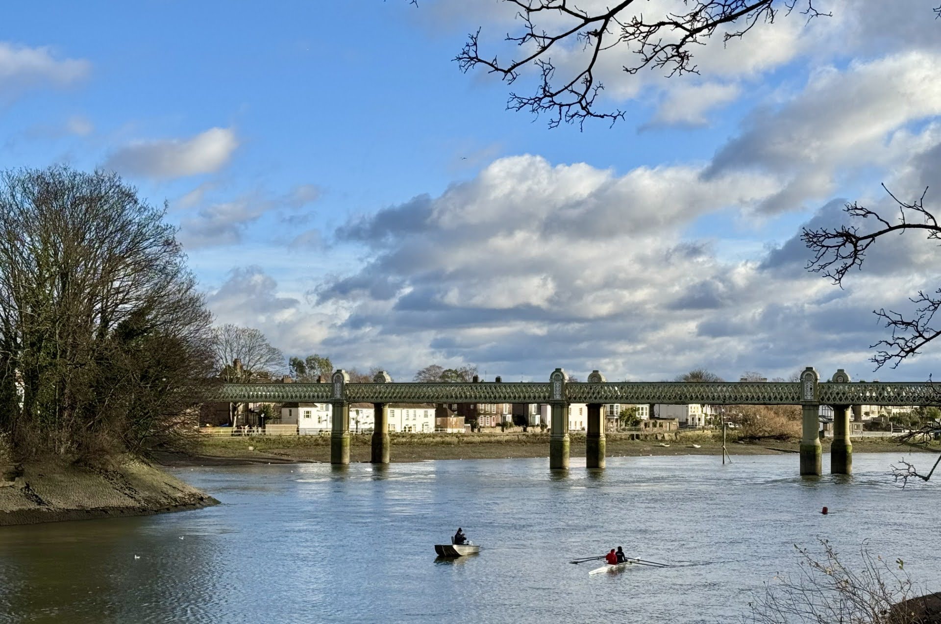 Twelve of us met at Cafe Torelli in Kew Village for hot drinks then set off briskly towards the south bank of the River Thames. We had blue skies and sunshine although the temperatures were a bit nippy. We passed the National Archives and the lovely Grade 2 listed Tube and Overground bridge which has been recently improved with new sleepers, then headed to see this year's Banksy surprise artwork at the side of the 1903 Kew Bridge and Kew Green. As we picked up the pace, we headed along the river past trees adorned with baubles, overhanging the river's edge, wondering how they had been decorated. Our next stop was Chiswick Bridge, then onto Barnes Bridge and finally the fabulous Hammersmith Bridge. This last bridge has been closed to road traffic since April 2019 after cracks in the bridge's supports were discovered. The potential repairs and future of the bridge have since been the subject of much controversy.