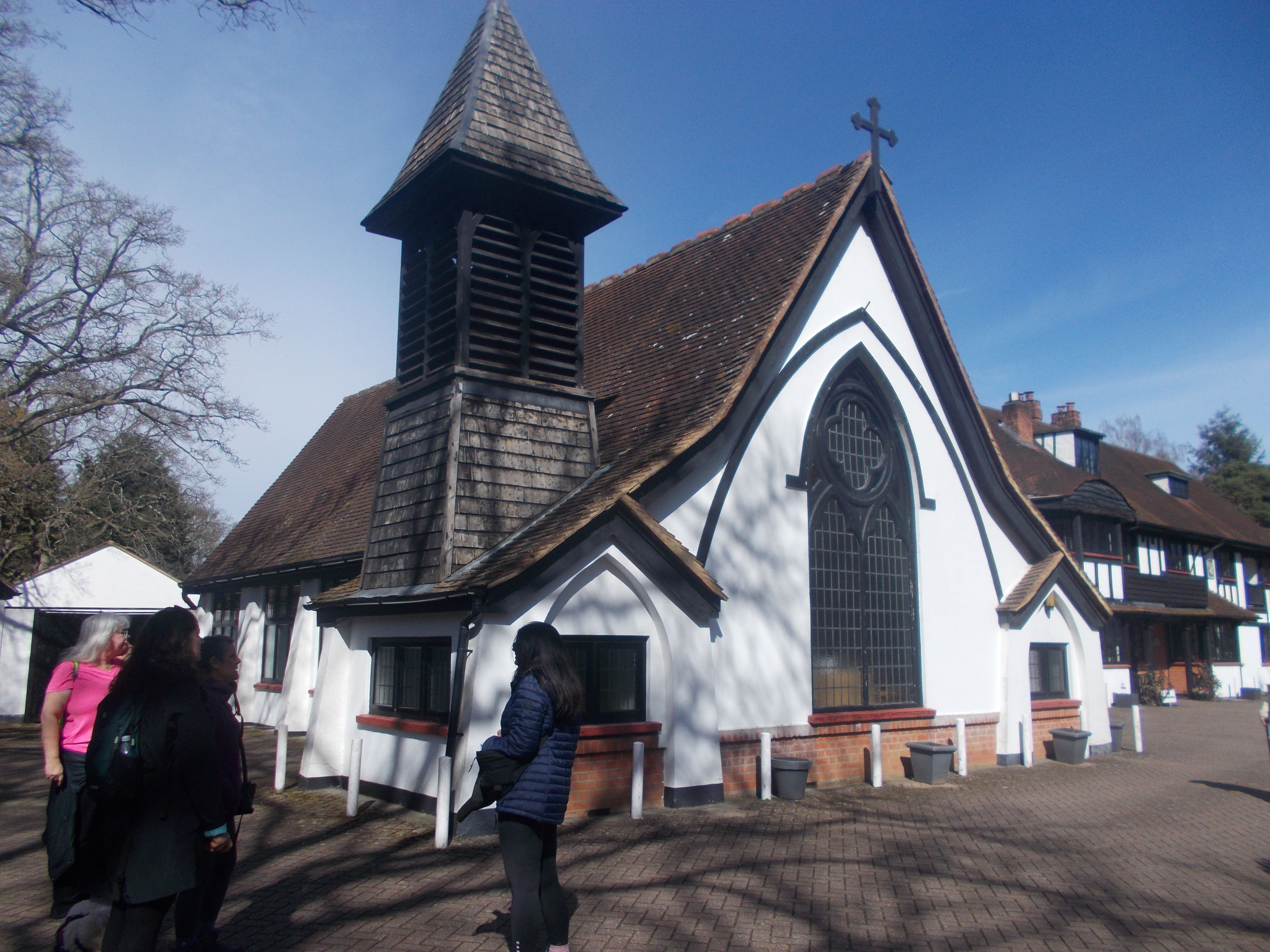On a very sunny morning eight orienteers arrived at the Black Park lakeside café. Some had taken part in the Black Park Parkrun earlier (over 700 runners). Over coffee we went through the orienteering map and route, then Luna greeted the latecomers and we were off. We took it in turns to use the map to find the hidden marker posts in the woods. Each post has a number (on the map) and a letter which must be noted to complete the course. We crossed by the Go Ape Course. "Can I do that, Derek?" asked Prem, prompting a firm "No" in response. Soraya led us to the next marker which took some searching in the very high gorse bushes. On route to the following marker, we happened upon a complete film set in the woods. Pinewood Studios use Black Park for location shooting; this set appeared to be for a Lord of the Rings-style movie, all camouflaged in the woods. We detoured off the park to the Bridgettine Convent with its shrine. We completed the course, finding the final markers before arriving back at the lakeside café for well-deserved tea and buns. As we took in the views, Harpreet, inspired by the nearby Pinewood, recounted her recent experiences as a film extra, the most notable being the recent wedding in Albert Square.