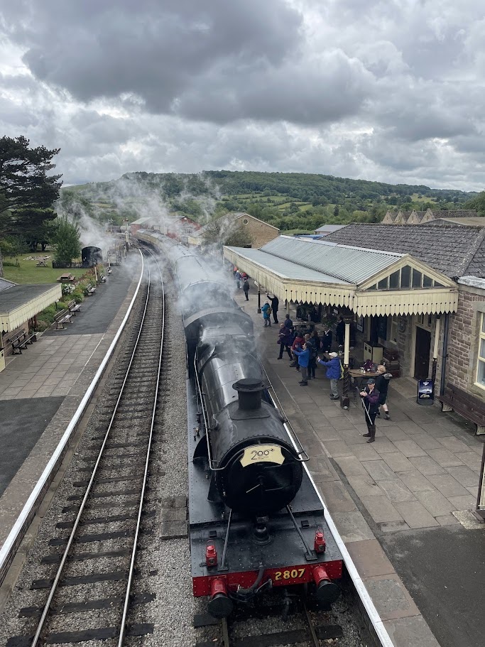 Saturday was another warm sunny day as we collected our cycles from Middleton Top Engine Room. Our cycle ride was following the High Peaks and Tissington Trail built on former freight used railway lines. The cycles were relatively new and perfect for the 26-mile ride. We crossed the White Peaks landscape, passing ancient stone-built manor houses and endless dry stone walls dividing the pastures. Some of the farmhouses had been converted into holiday cottages, and new wind turbines dominated one section. We detoured to Biggin village for coffee at the inn before arriving at Hartington Station. The signal box is still present and now houses a café. We climbed to the upper storey to try to shift the signal levers. We arrived at Pasley Hay Station where Judith exclaimed "I wish we could extend the ride, its jolly good fun". We met a late arrival and then headed back soaring along the former railway line on an embankment with great views of the rolling hills of the Peak District. Back at base more tea and Lemon Drizzle Cake before Brian led the railway group via a secret path to the Steeple Grange Light Railway. Next to the hostel, yet totally hidden from view, this is another former quarrying railway now a narrow-gauge line on an incline. We dined in Wirksworth without the mystery Sea Bass incident from Friday (a very long story). Mellow Mike was the star at the karaoke, the whole pub applauding his peerless performance of "Living next door to Alice". Back at the hostel it was last night party time as Jeff displayed his stealth skills by disappearing and rematerialising in unexpected places. Rob and Rob discussed vintage motorcycles whilst Nick and Jeremy demonstrated their suitability for solving the world's problems.