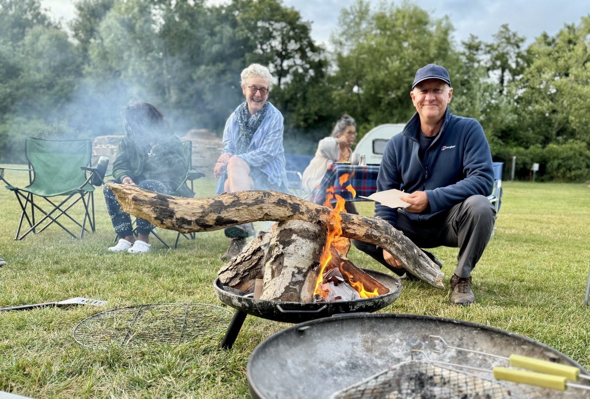 Our first camping expedition of the year saw us return to Home Farm at Radnage. We enjoyed great weather for the three days as always. The site has stunning views over the valley with a very relaxed management style. We pitched camp to the sound of Boom Radio with Louise sharing out the rather spiffing Victoria Sponge cake to all. Runi led the afternoon walk through nearby tracks and meadows. Two very well-groomed horses galloped over to greet us in a buttercup meadow, and we also passed sheep, lambs and alpacas on a very scenic route. We had a sumptuous meal in the Crown after a surprise announcement. Then time to light the campfire, we gathered around the blazing logs for Neil, Soraya and Coogee to lead the sing-song on three ukuleles in perfect harmony.