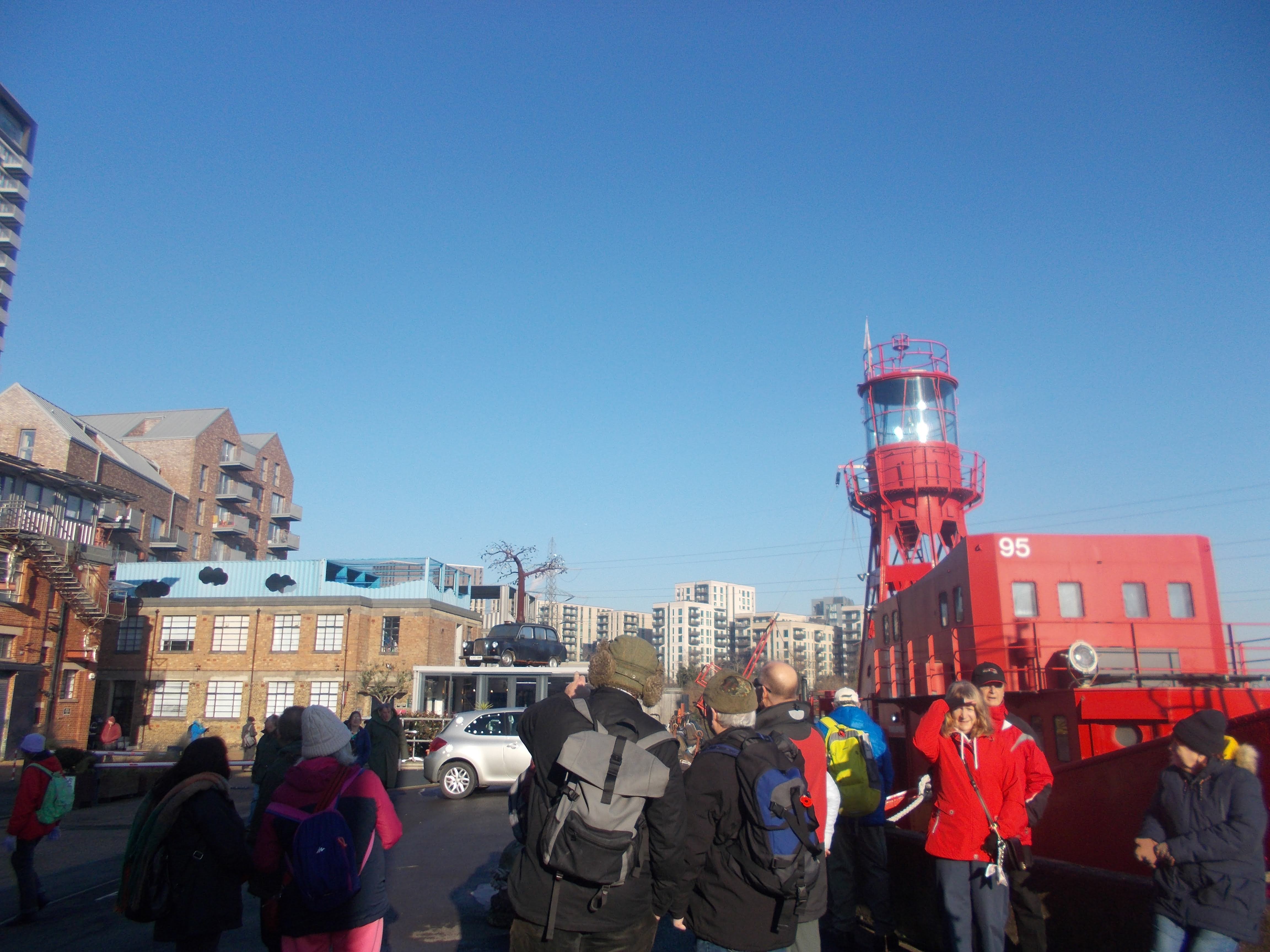 On a very sunny yet cold morning nineteen of us assembled for coffee and pastries at Pauls by the Tower Pier. We then jumped on the DLR and grabbed the front seat for a driver's view of the track. Kevin gave his observations of the line based on his decades as loco driver on the Northern line. We alighted at Blackwall to view Pontoon Dock and then East India Basin. Reaching the Thames promenade we took in the superb views of the Dome and Isle of Dogs. We stopped at the Virginia Memorial where the first colonists set sail for the New World. We then crossed footbridges to reach the hidden Trinity Buoy Wharf on City Island. This was the manufacturing base for all lighthouse equipment until recent years. We visited the museum and Faraday's exhibition (the inventor was important in the development of the lighthouses). The island quarter is full of art works and an area formed of former containers used as art studios. We had lunch there listening to the thousand-year long player, Peter and Mark O reminiscing about their days on the firing range.