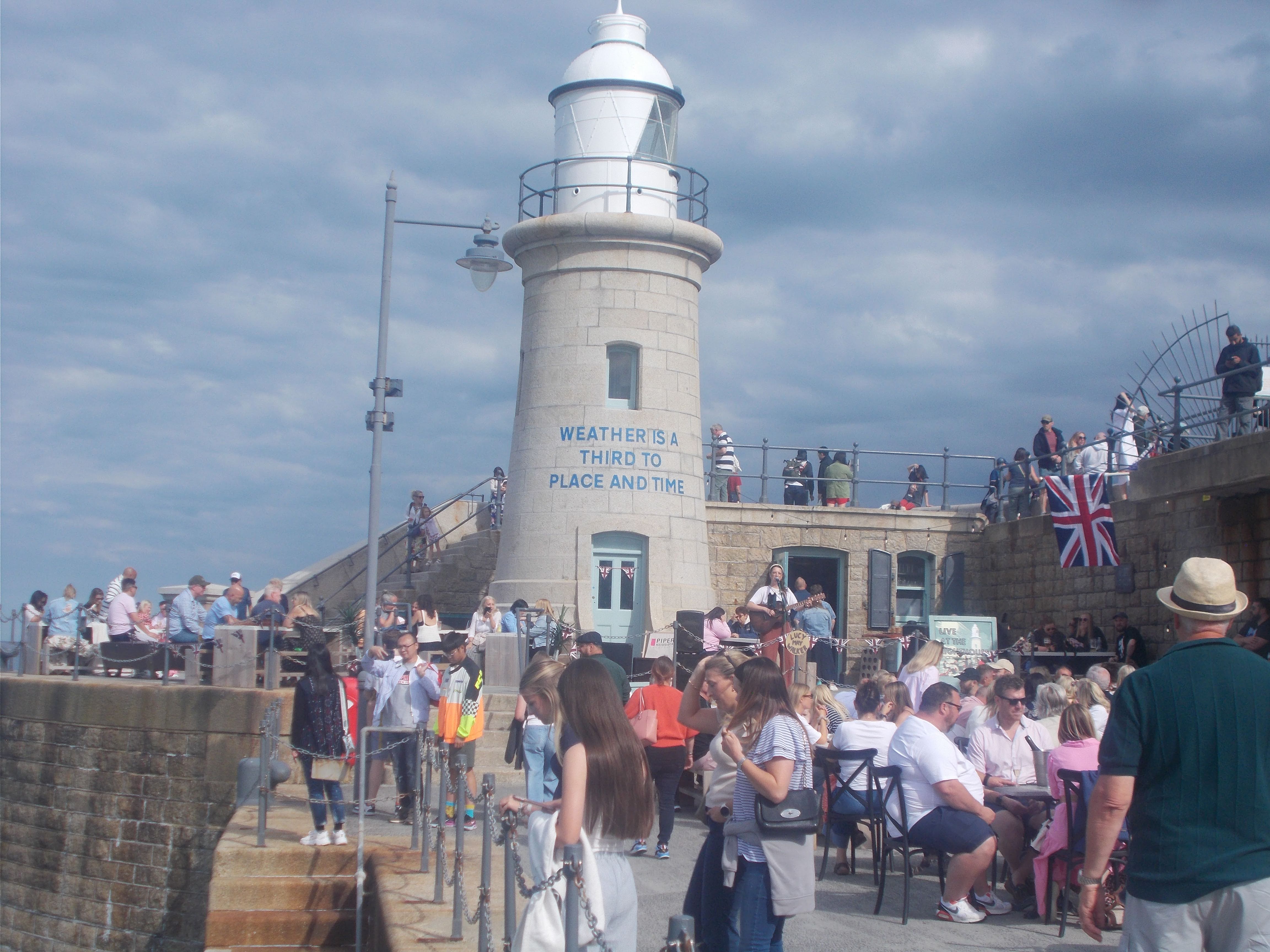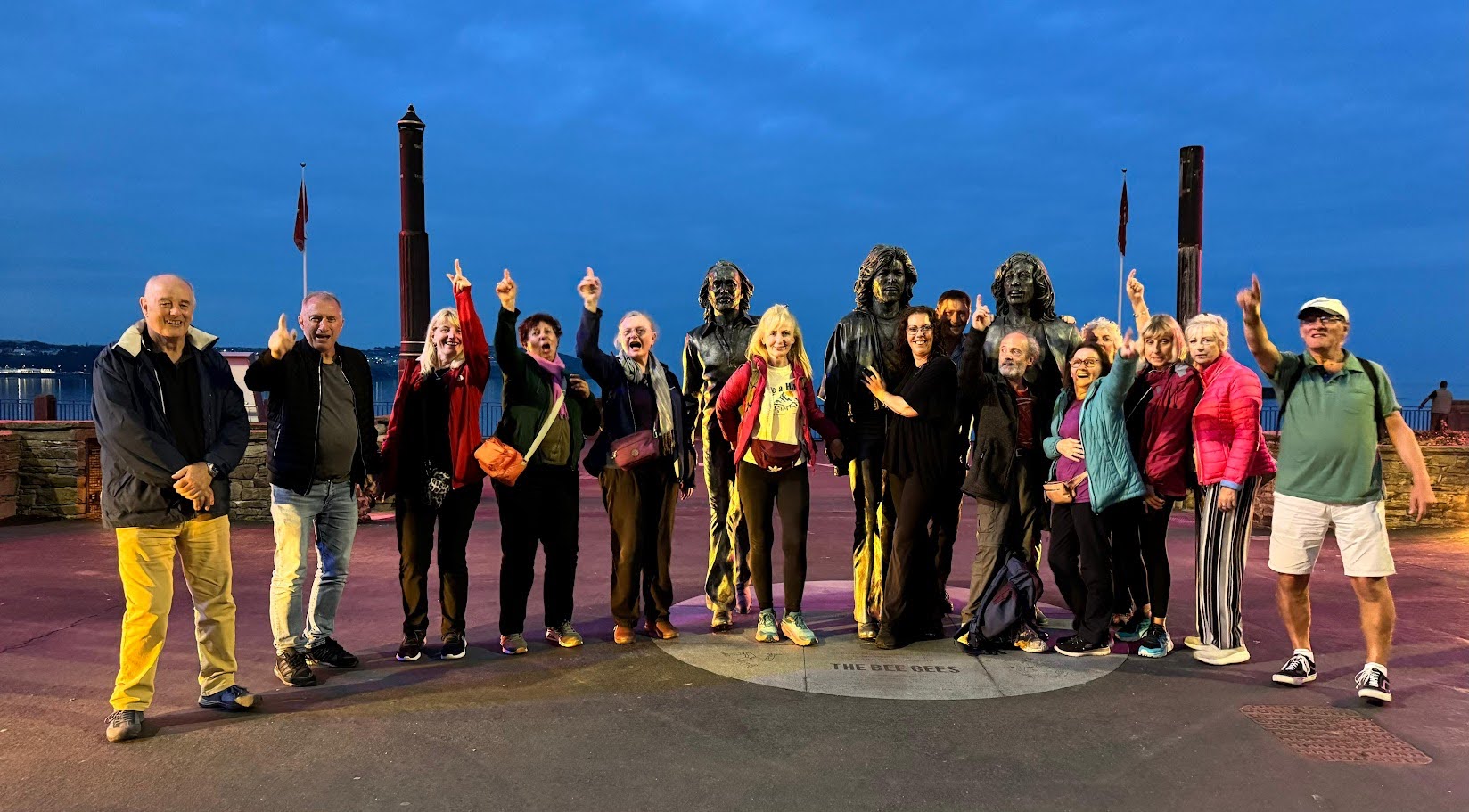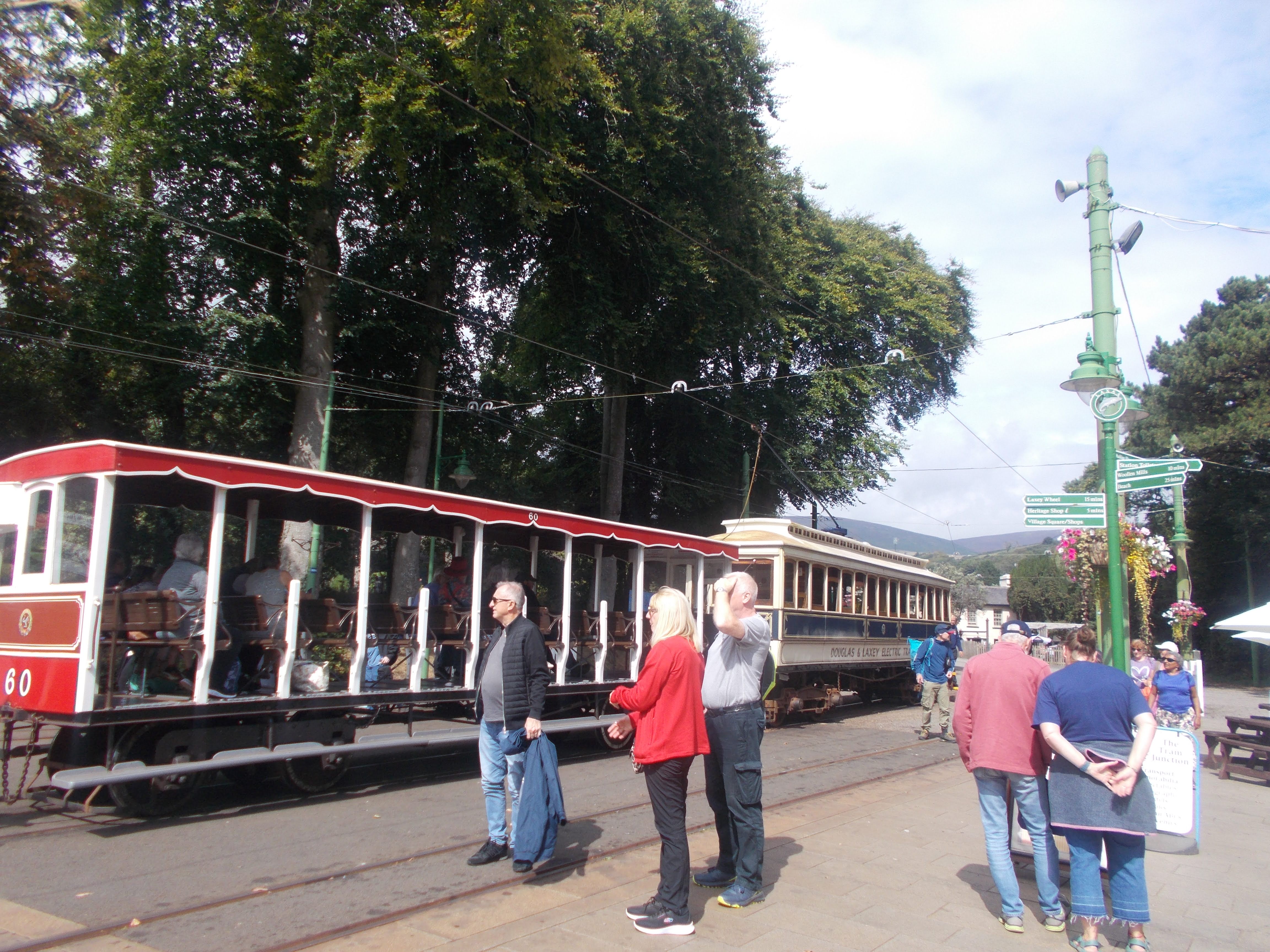 A full day of travel on the island's historic transport system was planned. After breakfast the group assembled at Castletown Station to catch the 10:27 steam train, which entered service in 1847 and still uses the original locomotives and carriages. The group took over a whole carriage for the 30-minute journey to the island capital of Douglas. On arrival at the station we then walked a short distance, pausing for a group photo with a life-size statue of the Bee Gees, who were born on the island. Our next mode of transport was on the Douglas Bay Horse Tramway. Dating from 1876, it's one of the last serving horse tramways in the world. At the end of this ride we arrived at the terminus of the Manx Electric Tramway. Having just missed the tram, the group made full use of the facilities of the Terminus tavern whilst waiting for the next tram to arrive. Our journey on the electric tram followed the island's eastern coast, offering outstanding views of the countryside as we made our way to Laxey. On arrival at Laxey we changed onto the Snaefell Mountain Railway. which opened in 1895. As we made our way up the mountain the railway passed the famous Laxey mine and gave outstanding vies of Laxey Wheel. On our journey to the summit, the railway stopped short as it crossed the mountain section of the Isle of Man Grand Prix course and motor cycle racing was taking place. Rather than taking the footbridge over the road and continuing the journey to the summit on another train, some of the group decided to stay and watch the racers pass through this section of the track. After everyone returned to Laxey the group split, with some making their way back to Castletown on the bus and Brian leading a small group who were taking advantage of the electric railway late night service onto Ramsey to eat there and brave an illuminated open carriage ride back to Douglas on the electric railway before returning to Castletown. Saturday evening was very busy in Castletown. The town was holding a free weekend music festival in the town square which many of the group took advantage of.