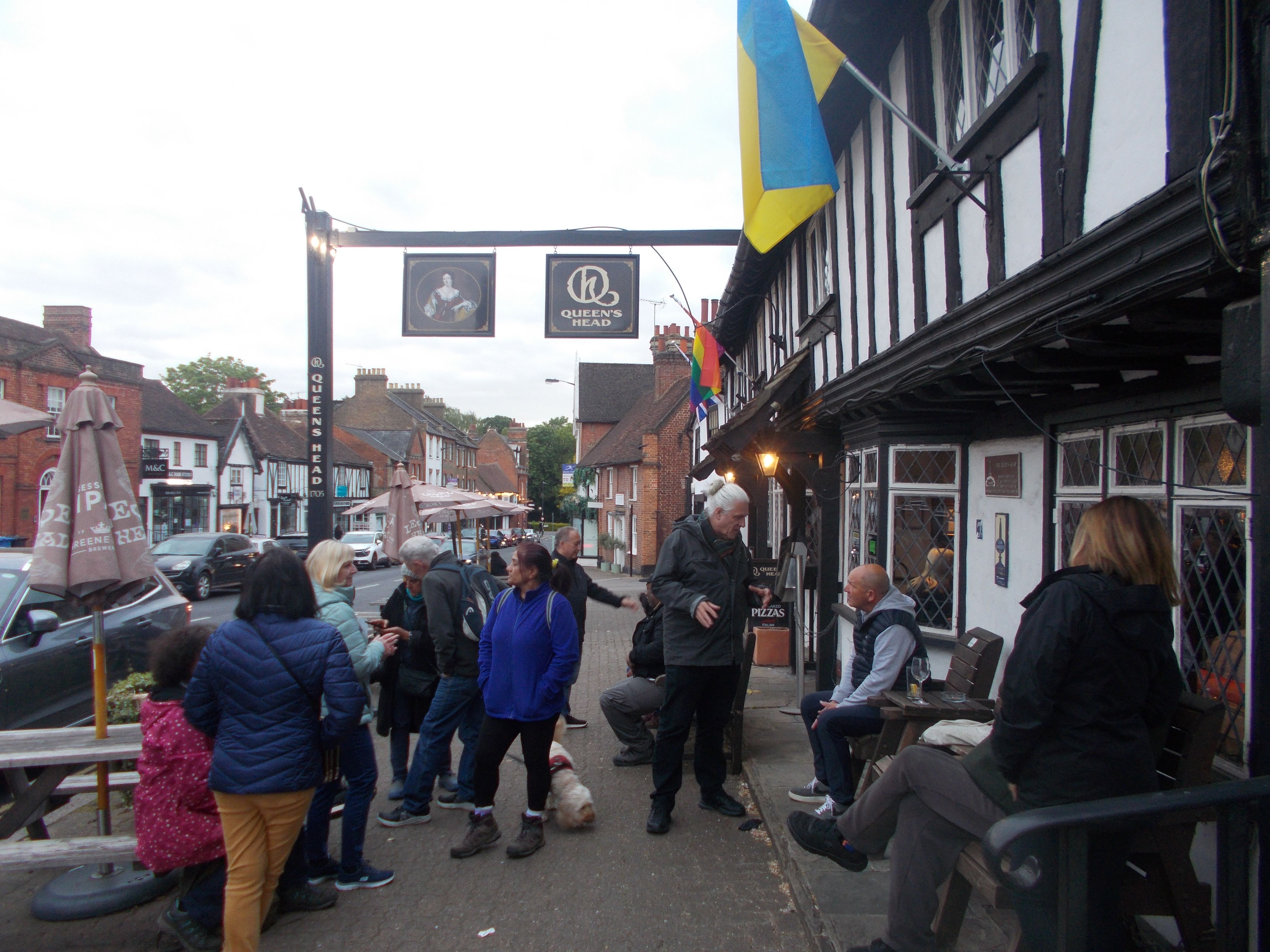 Our first evening walk of the season started and ended at the Queens Head (established in 1540) in Pinner. A record seventeen walkers followed the Pinner Association "10 walks around Pinner" guide north via the Grail Centre and the former village well. We continued through Metro-Land suburbs of Pinnerwood Park with rose gardens and manicured lawns. Then onwards to the lush meadows of Pinner Hill. We admired Pinner Hill House and the fine Victorian Pinner Hill Farm (very ornate timber and brickwork). Mi Faw and Luna took advantage of the empty countryside to race ahead on the trackway. We next climbed to the summit of Pinner Wood and the viewpoint from the Georgian Mansion of Pinner Wood House. Our route then descended south, passing several detached villas on the private roads of this secluded quarter. Kevin and Louise impressed us with local knowledge when pointing out former homes of Elton John and Bob Holness. The walk ended back at the Queens Head for well-earned refreshments and fascinating tales from Louis, Con and Mike about rock stars from the area.