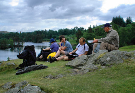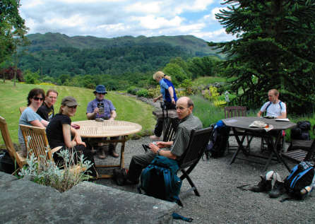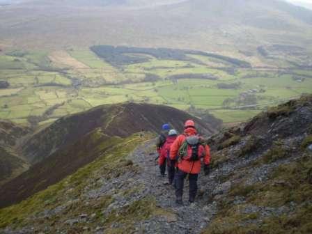 The Sunday morning began with rain again, but thankfully cleared later for some good pictures. The day included rope instruction, knots and rope use. This was followed by a walk/scramble up Blencathra via Halls Fell. http://www.lakedistrictwalks.com/hall1q.html. This web site details the walk exactly - http://www.lakedistrictwalks.com/blenhf.html. Graham and Paul (2) were roped together and also Jim and Mike in pairs, whilst the others walking the main path which was a strenuous route. In addition to the rope work - tying on, belaying and walking whilst roped: a short improvised abseil was carried out which was interesting and all good fun.