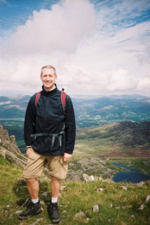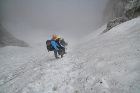 The Saturday began with a steep climb to near the top of Helvellyn, with compass and navigation exercises on the way up and also being made aware of changing weather conditions. It was a typical summer day (his words) with winds at 30mph and heavy rain with visibility down to 60 yards and about 6 degrees C. Our final destination was to be near a ski lift/shelter, where luckily there was a patch of snow on a slope which was large enough for us to practice on. We carried out ice axe arrest exercises which involved sliding down the snow slope, on your front, back and upside down and using the ice axe (pointed end) to stop your fall. This proved to be great fun for all. Somehow I managed to get this wrong by panicking on the way down and jamming in the handle end of the axe which flipped me over...ouch! Some learn the hard way. We also practised walking methods in the snow and using the spiky foot crampons. We had talks in the evening which covered avalanches and testing for avalanche conditions, and also on hypothermia.