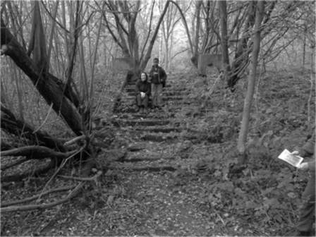 After lunch we visited the Ruislip Lido Woodlands Centre taking the opportunity to find out more about the area and also warm up. Walking past one of the capped bore holes we headed to the site of the Battle of Britain House hidden amongst the trees in Copse Wood. There we managed to locate a concrete staircase and compare it to a photograph taken in 1953. The American Secret Service trained agents at the house between 1940 - 1945 and on our way to Poor's field passed mounds of earth used as bullet traps. In Poor's field we found the foundations of an old stone cottage and successfully managed to identify a number of mushrooms including Fly Agaric and Parasol. Next we walked around the Lido and some of the more physically fit amongst us tried their hand at the assault course close to Ruislip Lido railway Woody Bay Station.