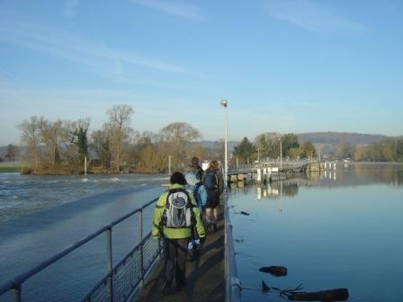 The end of the walk took us down along the Thames, which was slightly misty, peaceful and atmospheric in the soft winter light. We were surprised too at the level of flooding along the banks of the Thames and had first hand experience of being marooned, as we found ourselves stranded on a strip of patches of soggy land surrounded by water! Couragious Steve took the plunge and took a giant long jump from one 'island' to the other, whilst the rest of us dithered in his wake, especially when Mark tested the depth with his walking stick and we realised it was over a metre deep!!!! Caroline (using ingenuity), discovered some discrete clumps of grass along the edge and found that, if trod on carefully, one could pass through with minimal drenching, and with relief, we followed suit. Kate ventured forth, only to be knocked off balance by an exhuberant labrador, and sank spectacularly into the water!!! Fortunately, this happened at the end of the walk and she had a spare set of clothes, so she was able to dry off quickly.