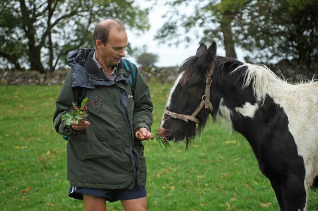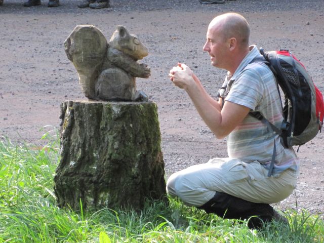 Saturday dawned with commis chef Mark frying a whole pig for him, Mick and Steve T, over the top of Martina who had been banished to sleep in the dining room. The weather came and went, drizzle followed by sun, followed by scudding clouds as we wandered through the woodlands over the Quantocks to Crowcombe. A 7.5 mile walk was punctuated by quad bikes rounding up wild ponies in the annual count, and massive pixies on red toadstools (this was the Coleridge walk after all). Unexpected home-made apple cake and tea were found in the Holy Ghost church, when we usurped a sponsored walk raising money for churches, and stole the cake before they arrived. Jane showed us the unusual carvings in the 14th century church on the end of the benches, which showed two-headed dragons being slayed by naked men. A leisurely pub lunch stop allowed Martina to regale the locals with tales. Brian G and others stayed outside for chips and encountered a very grumpy landlady whose husband was being regaled by Martina, and offered to come over later for a fiver. The afternoon brought a walk back over the Quantocks, through the Great Wood with purple and yellow heather to the horizon, and lush valleys. We made it home for 5 o'clock tiffin, with Jane's fab carrot, walnut and banana cake to contribute to the obligatory 5 a day fruit ration.