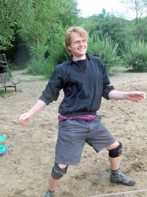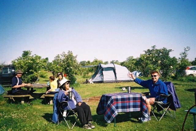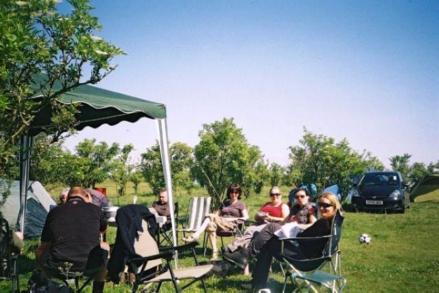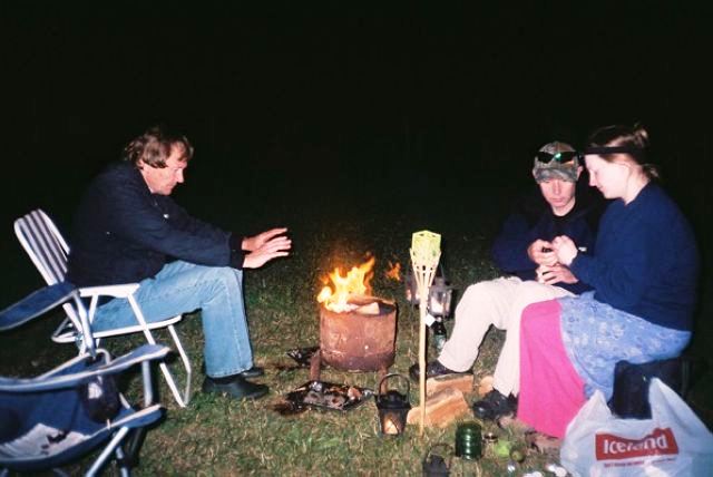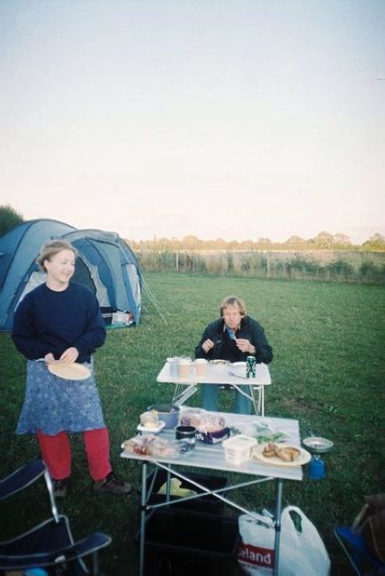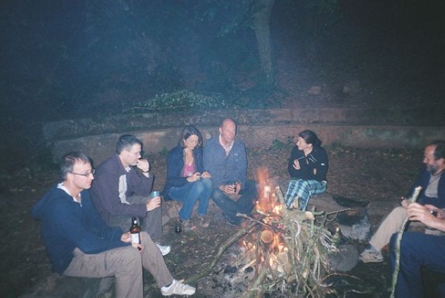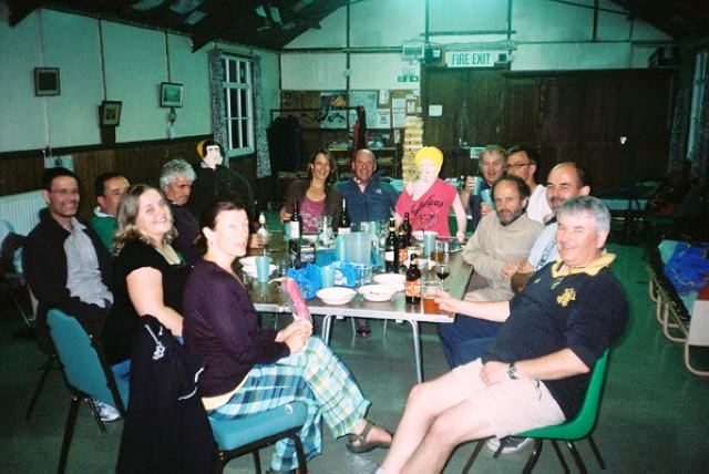 Dinner ensued with Mick and Humay helping set the table, and excellent washers-up Tim, Steve and Mike, showing keenness and willingness beyond duty. Evening brought out Brian F's guitar, and Mark "women wear these bras, but men don't bother with them", provided some special entertainment, by bringing new friends Magda and Gary along for the night for a singsong, before they had to fly off. Jan got a stick of rock as a present to remember the weekend. It brought tears to her eyes as she'd never seen one as big as that before. Humay and Jane attempted to rival the scouts who had been there before us, by creating a HAWOG poster to adorn the spaces on the walls. There weren't enough Quality Street wrappers to manage this though, so we had to make do with a HAWOG leaflet. Mike got the campfire blazing, as we all sang along to 'Magic Moments, filled with love'. Jeff became very emotional at memories of jamborees past.