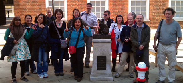 What a day of street walking surprises. Prem and Derek, Efisia, Mary T and Nina, all heartily taking it in. We witnessed the Shard construction (later to be our Mike-inspired group chant, replacing cheese for the photo shoot). We stroked Dr Johnson's cat. We studied a crypt and walked through a small religious ceremony before comtemplating a Dickensian mugging location, and the route of the once-putrid Fleet River.
