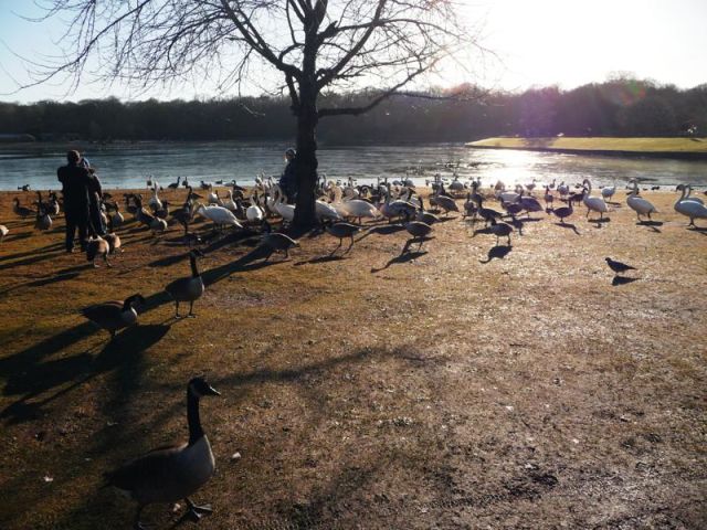 Set off after skating across the car park and making use of the pub's conveniences. The Lido was a pretty partially-frozen site with hundreds of birds congregating by the side of the footpath. Having left my camera at home again, Prem was declared HAWOG photographer and promptly shot more pictures of the wildlife staying behind while we continued along the path to the south of the lake towards Park Wood. Tried to stay away from the main churned-up ground of the bridle ways, testing my sense of orienteering. Followed the footpath routes of a 30-odd-year old road map. Paths were covered in leaves, not looking any different to any other ground, and trees at this time of year all look the same too. Made a bit of an alteration to my intended route in order to get back to firmer ground and fixed landmarks, round the golf course, back to the Waters Edge pub. It was too early for lunch so we went on an easy route right round the lake along the footpath next to the miniature railway line. No one fancied playing any games on the beach, but everybody seemed to enjoy the chats between U3A and HAWOG members. Lunch in the pub afterwards turned out to be exclusive to HAWOG.