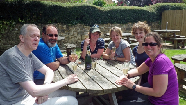 On the Sunday, 7 of us walked the remaining 10 miles of the Cotswold Way from Stanton to Chipping Campden. Once again, an occasional shower in the morning didn't trouble us too much, and after an early lunch, the afternoon was much sunnier. We completed this final section of the national trail early in the afternoon, so we celebrated in style with a glass of champagne in a local hostelry, before heading home.
